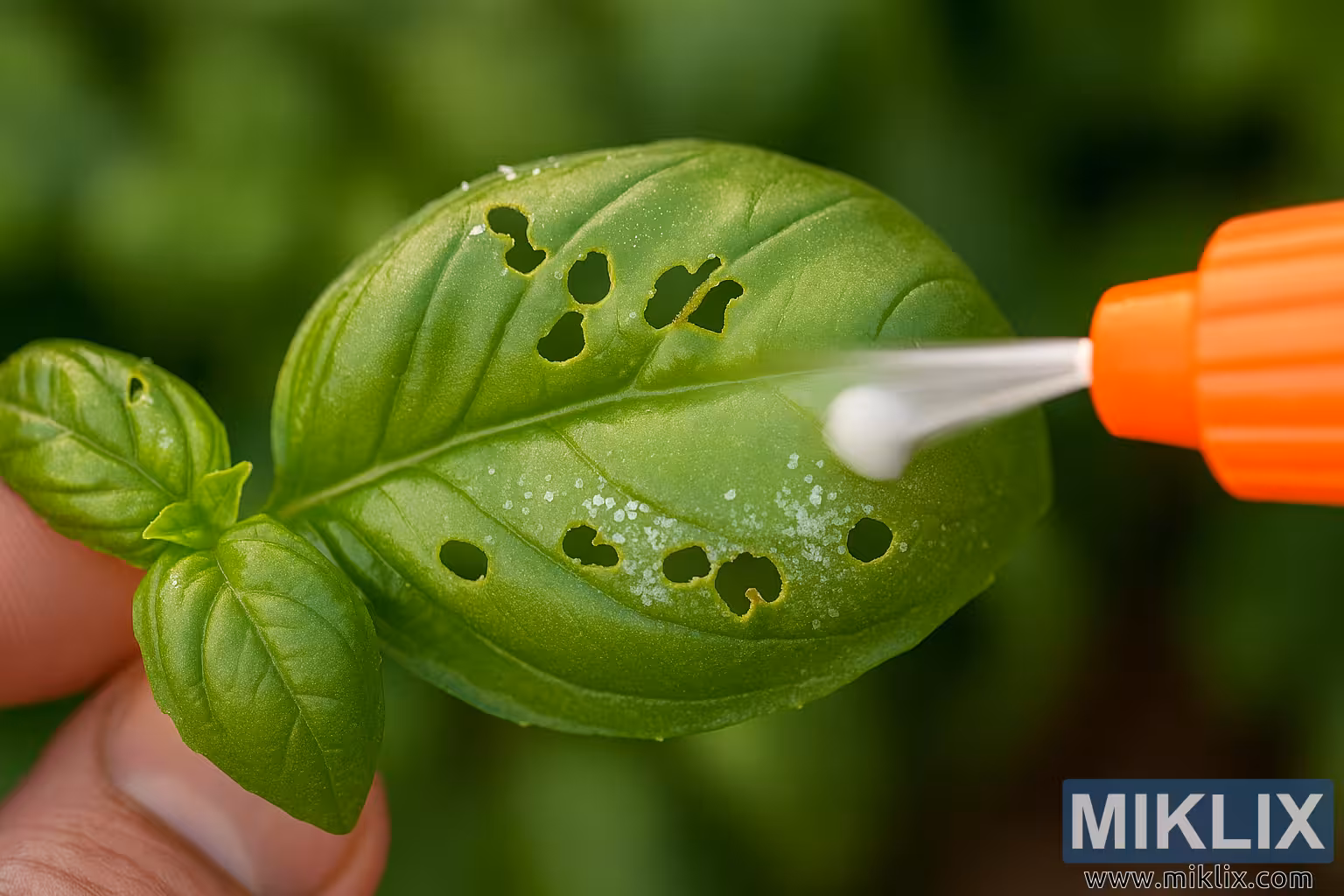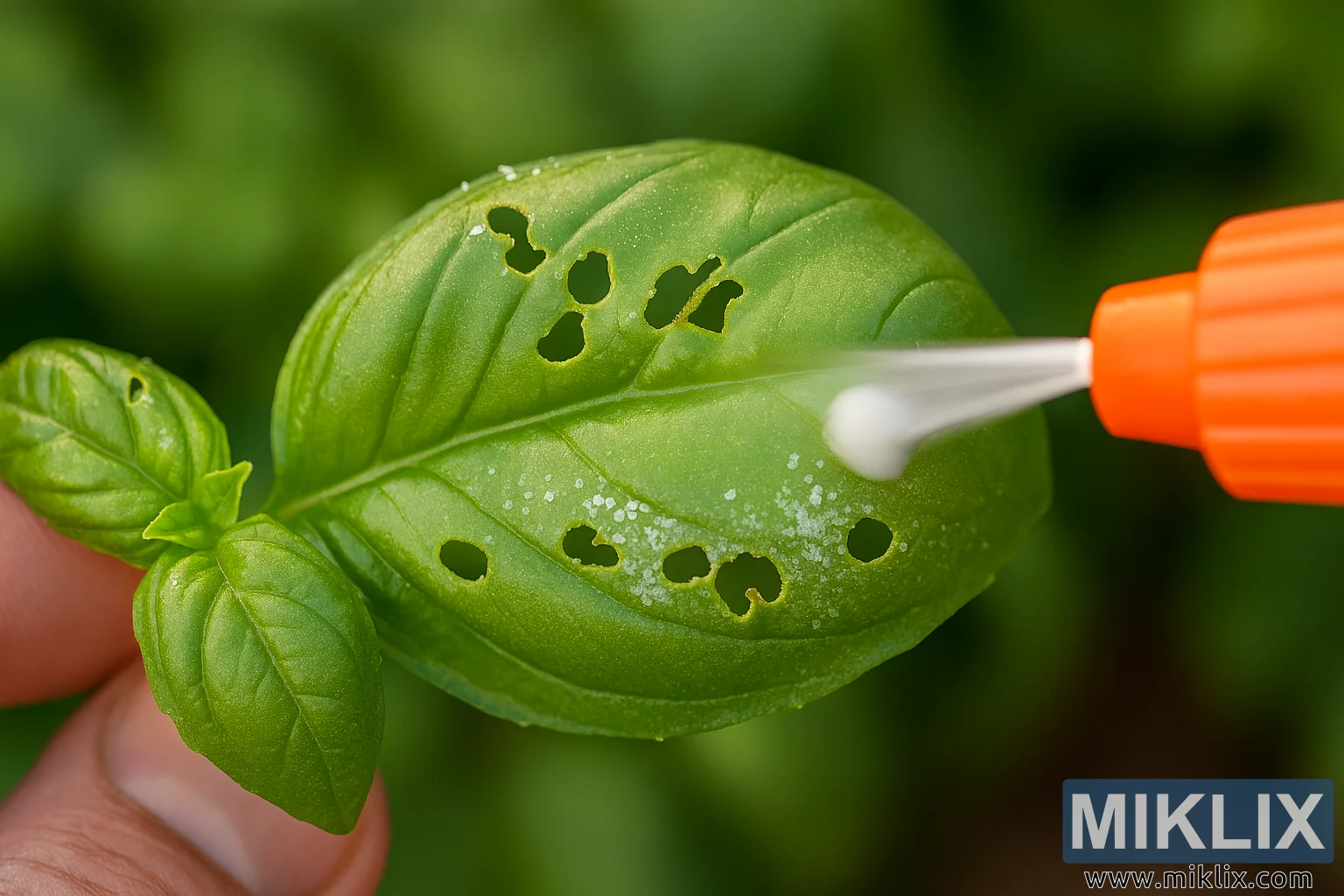 Imagem de alta resolução mostrando danos causados por pragas em uma folha de manjericão e a aplicação de tratamento orgânico com um bico de pulverização.