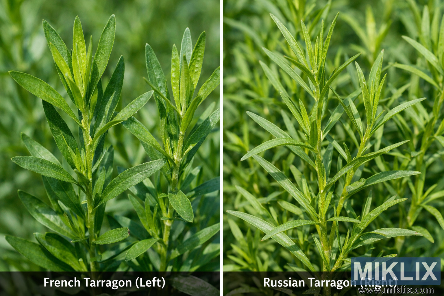 Comparação visual detalhada do estragão francês e russo, mostrando estruturas foliares, hábitos de crescimento e características botânicas contrastantes em uma fotografia lado a lado.