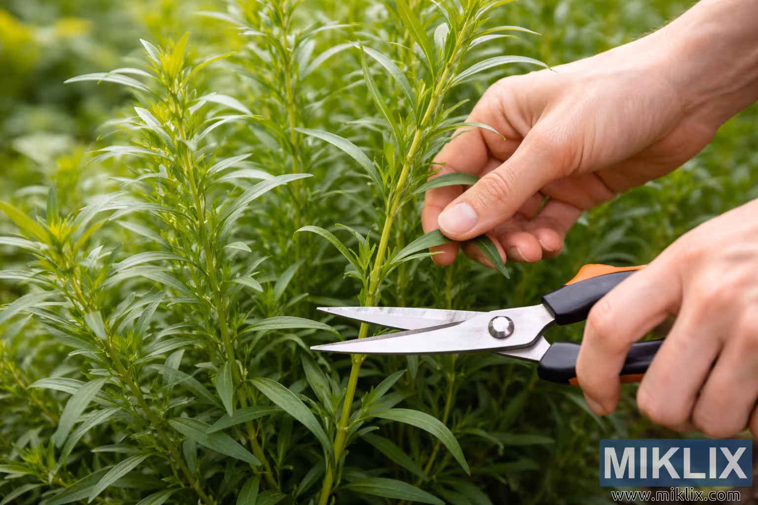 Imagem: Colheita adequada de estragão com tesoura de jardinagem