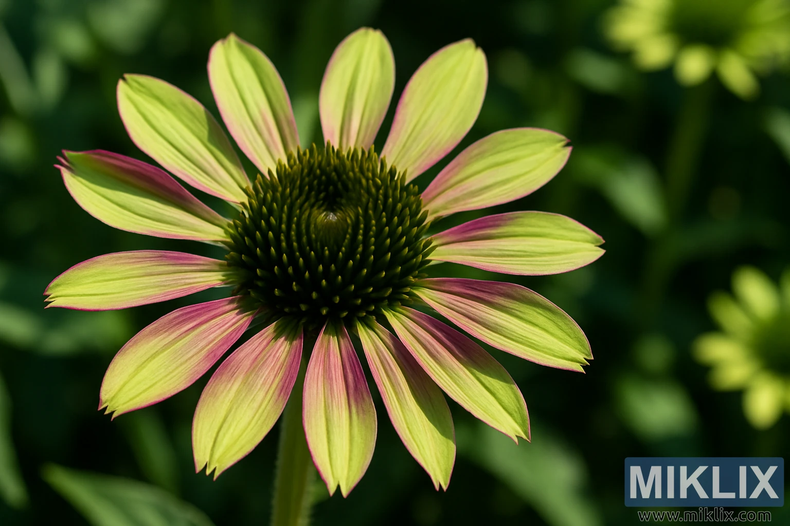 Em suma, a imagem é uma celebração da arte natural. As pétalas em degradê da equinácea 'Green Envy', o verde intenso da sua concha e o cenário luminoso de verão criam um retrato que é ao mesmo tempo fascinante do ponto de vista científico e esteticamente belo. Captura um momento de perfeição botânica — uma fusão de estrutura, cor e luz que personifica a encantadora diversidade do mundo vegetal.