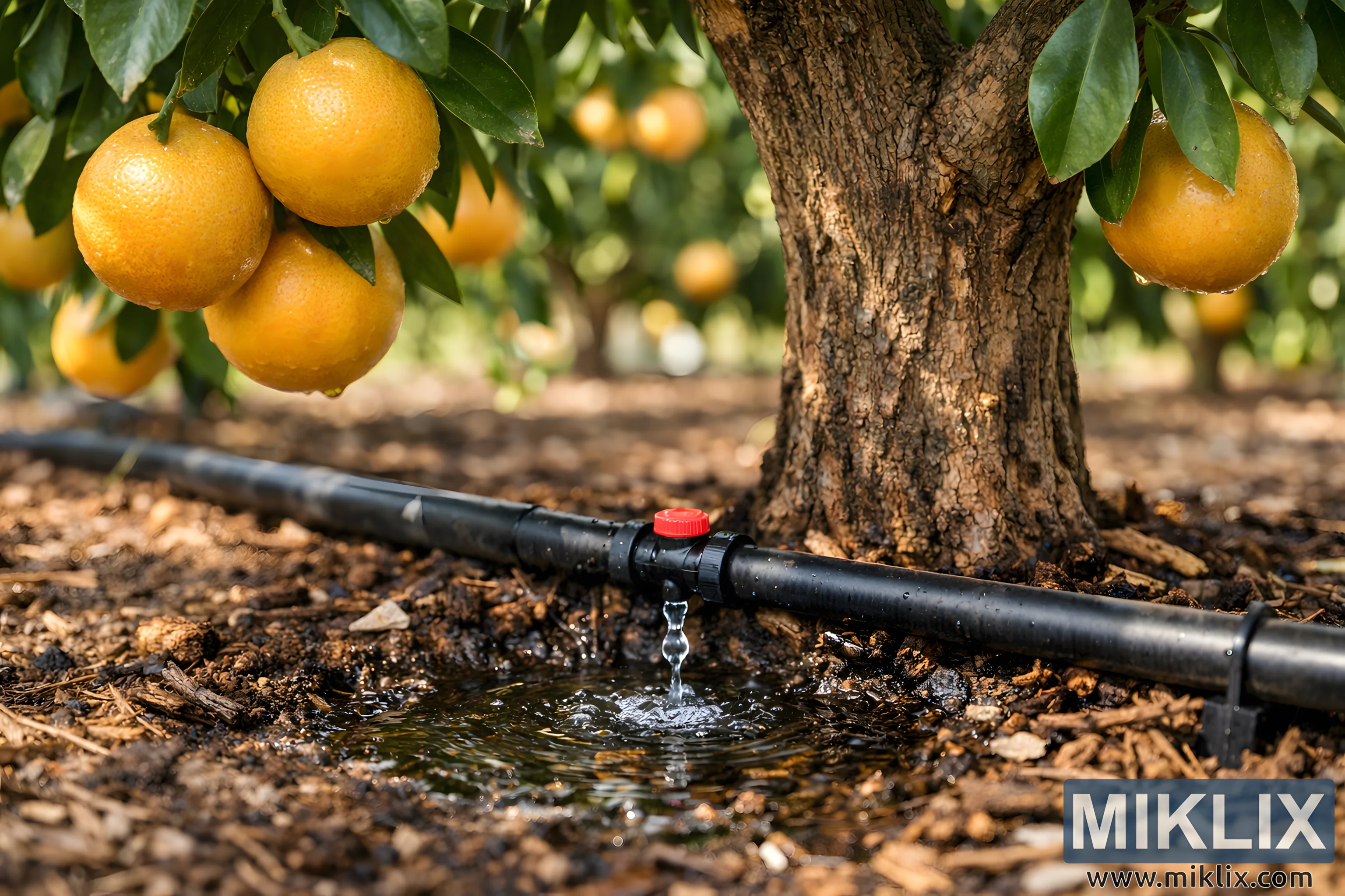 Imagem: Irrigação por gotejamento eficiente para árvores de toranja