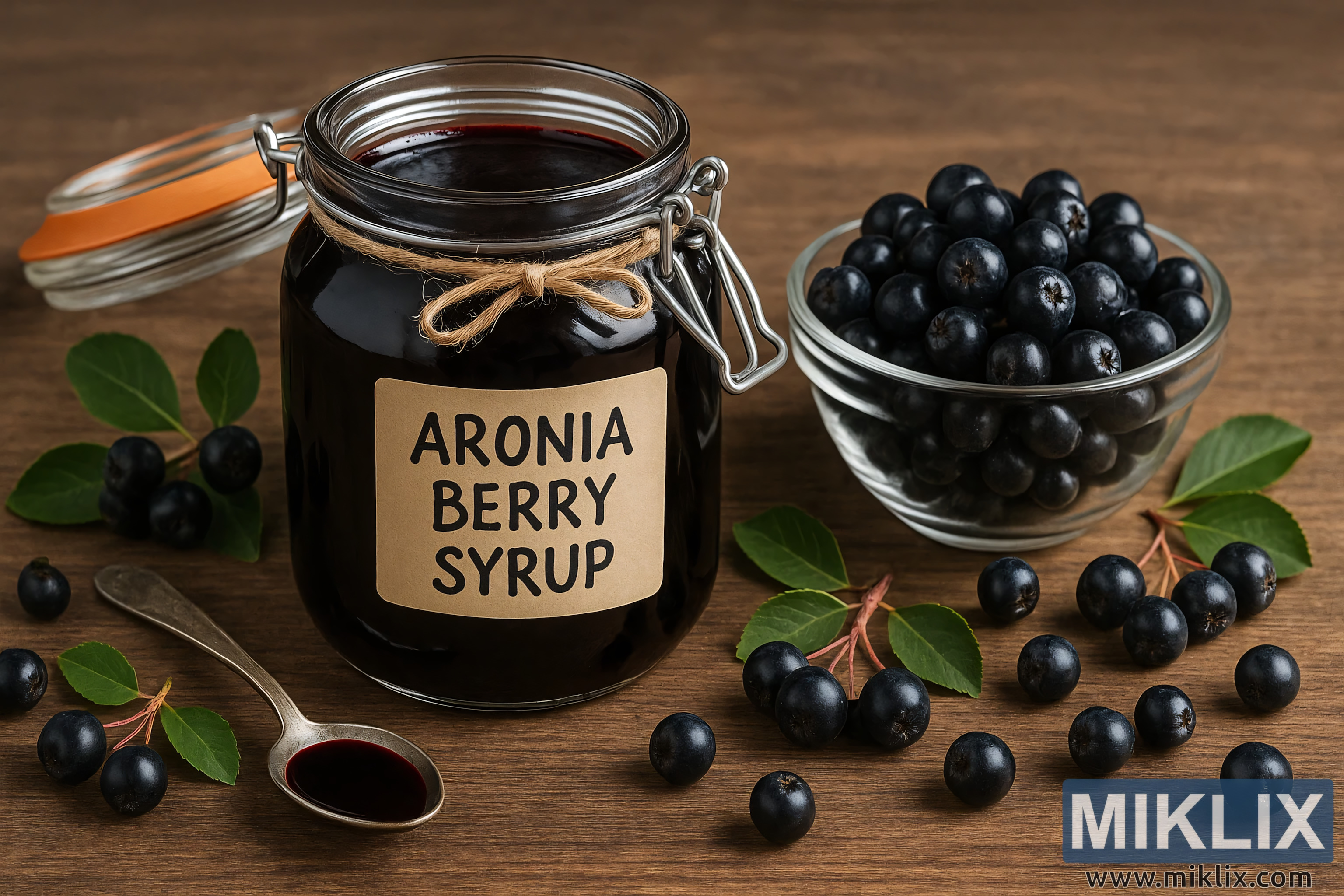 Fotografia em alta resolução de xarope caseiro de arônia em um frasco rústico, rodeado por bagas de arônia frescas, folhas verdes e uma colherada do xarope roxo escuro sobre uma superfície de madeira.