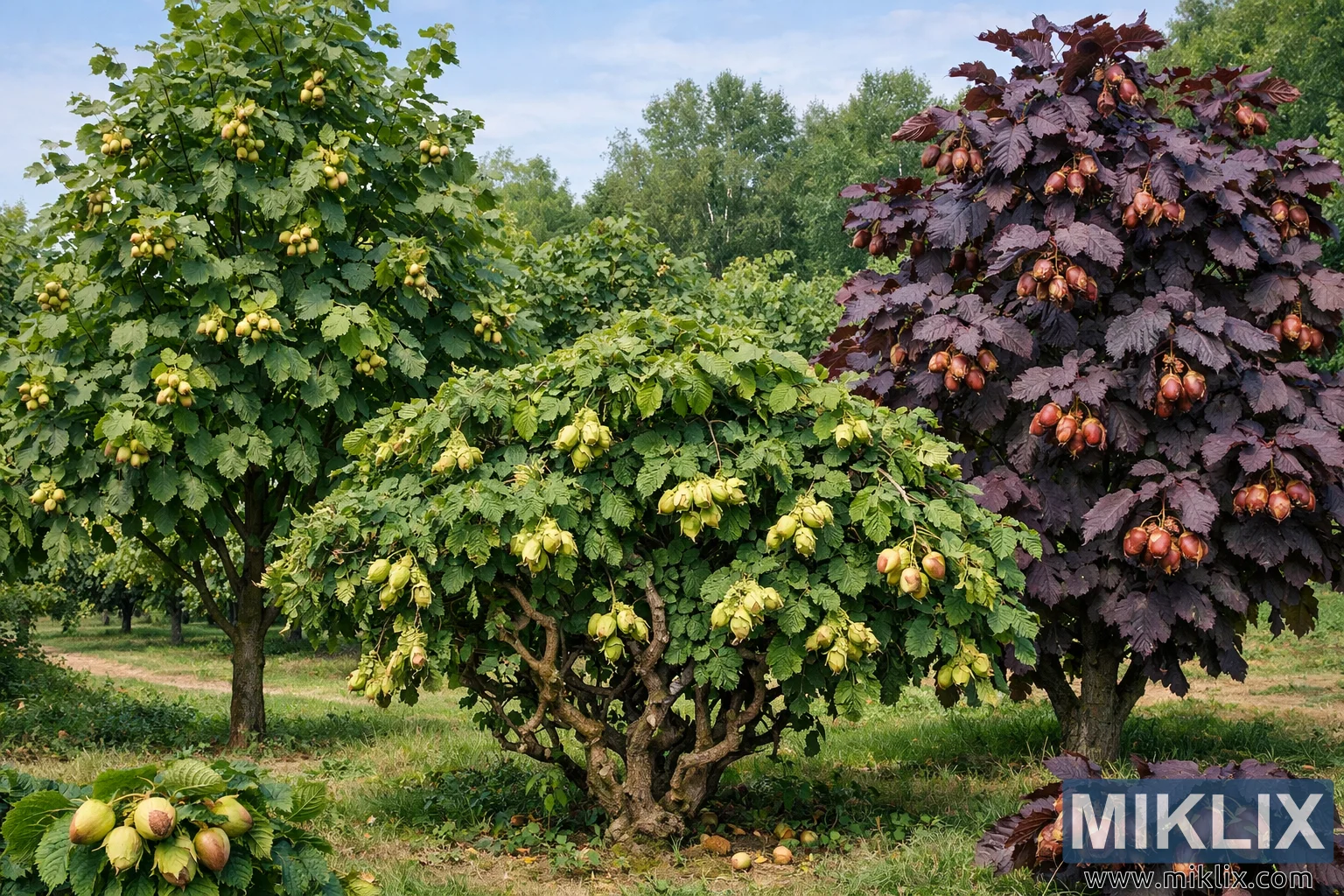 Imagem: Diferentes variedades de aveleiras em um pomar produtivo