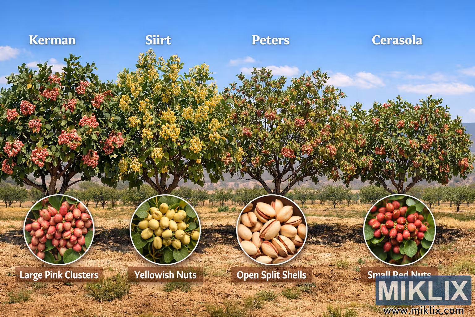Imagem de paisagem em alta resolução comparando diferentes variedades de pistacheiro, destacando as cores distintas das nozes, as características da casca e os hábitos de crescimento do pomar.