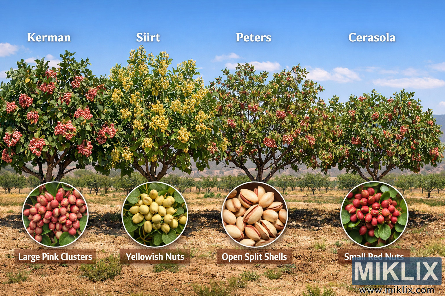 Imagem apresenta uma fotografia panorâmica de um pomar de pistache, concebida para comparar diferentes variedades de pistache lado a lado. Quatro pistacheiros adultos estão alinhados em linha reta ao longo da imagem, cada um claramente separado e visualmente distinto, permitindo ao observador notar diferenças na forma da copa, densidade da folhagem e aparência dos frutos. O cenário é uma paisagem agrícola ensolarada, com solo seco e arenoso em primeiro plano, fileiras de pomar espaçadas uniformemente que se estendem ao longe e colinas suaves sob um céu azul claro com algumas nuvens tênues. Da esquerda para a direita, a primeira árvore, identificada como Kerman, exibe densos cachos de pistaches grandes com cascas externas vermelho-rosadas, que se destacam entre as folhas verde-escuras. A segunda árvore, identificada como Siirt, tem uma copa verde ligeiramente mais clara e está coberta por abundantes cachos de pistache amarelados, conferindo à árvore uma aparência mais brilhante e dourada em comparação com as árvores vizinhas. A terceira árvore, identificada como Peters, apresenta menos cores na casca externa, mas está associada a pistaches conhecidos por suas cascas abertas e fendidas. Essa característica é enfatizada por meio de uma imagem circular inserida perto da base da árvore, que exibe cascas bege abertas, revelando a noz em seu interior. A quarta árvore, identificada como Cerasola, parece um pouco mais compacta e é caracterizada por numerosas nozes de pistache pequenas e vermelhas, que contrastam vividamente com a folhagem verde-escura. Abaixo de cada árvore, uma imagem circular ampliada destaca a variedade específica de pistache, fornecendo detalhes sobre o tamanho, a cor e as características da casca da noz. Essas imagens são acompanhadas por breves legendas descritivas, como "Grandes Cachos Rosados", "Nozes Amareladas", "Cascas Abertas" e "Nozes Vermelhas Pequenas", reforçando as diferenças visuais entre as variedades. A composição geral é limpa e didática, combinando fotografia realista com elementos infográficos sutis. A iluminação natural intensa realça a precisão das cores e a textura, tornando as folhas brilhantes, as nozes vibrantes e o ambiente do pomar acolhedor e convidativo. A imagem comunica eficazmente a diversidade botânica no cultivo do pistache, mantendo um layout visual esteticamente agradável, equilibrado e informativo.