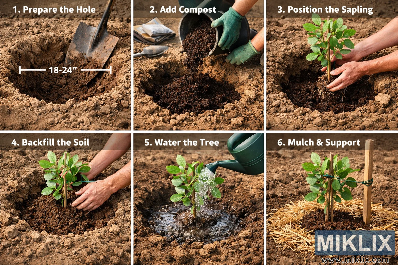 Imagem de paisagem em alta resolução ilustrando todo o processo passo a passo de plantio de uma muda de pistache, incluindo preparação do solo, compostagem, plantio, rega, cobertura morta e suporte.