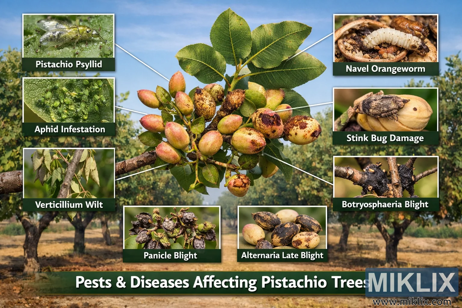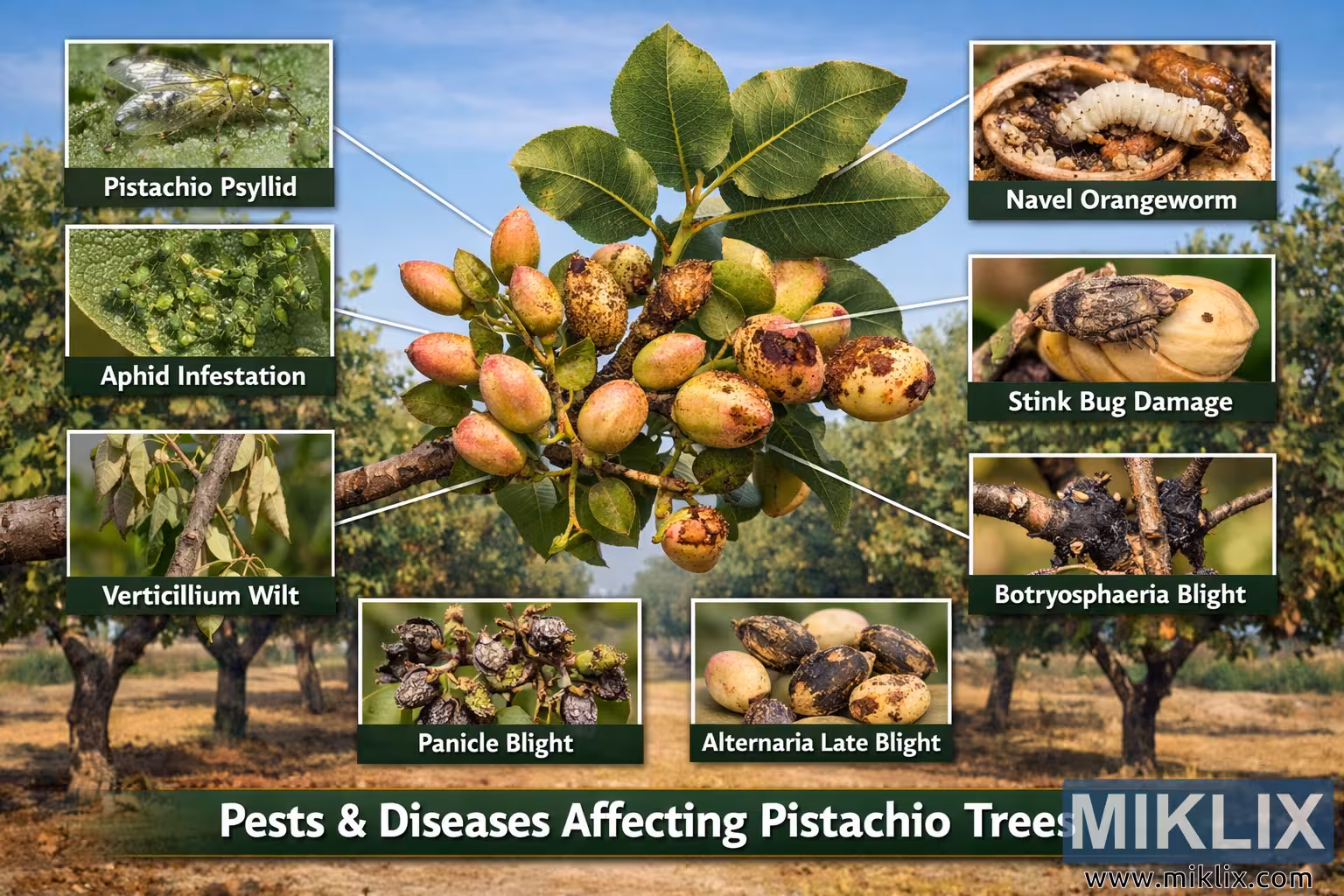Infográfico de alta resolução ilustrando as pragas e doenças comuns que afetam os pistacheiros, com imagens ampliadas e legendadas para fins de educação agrícola e manejo da cultura.