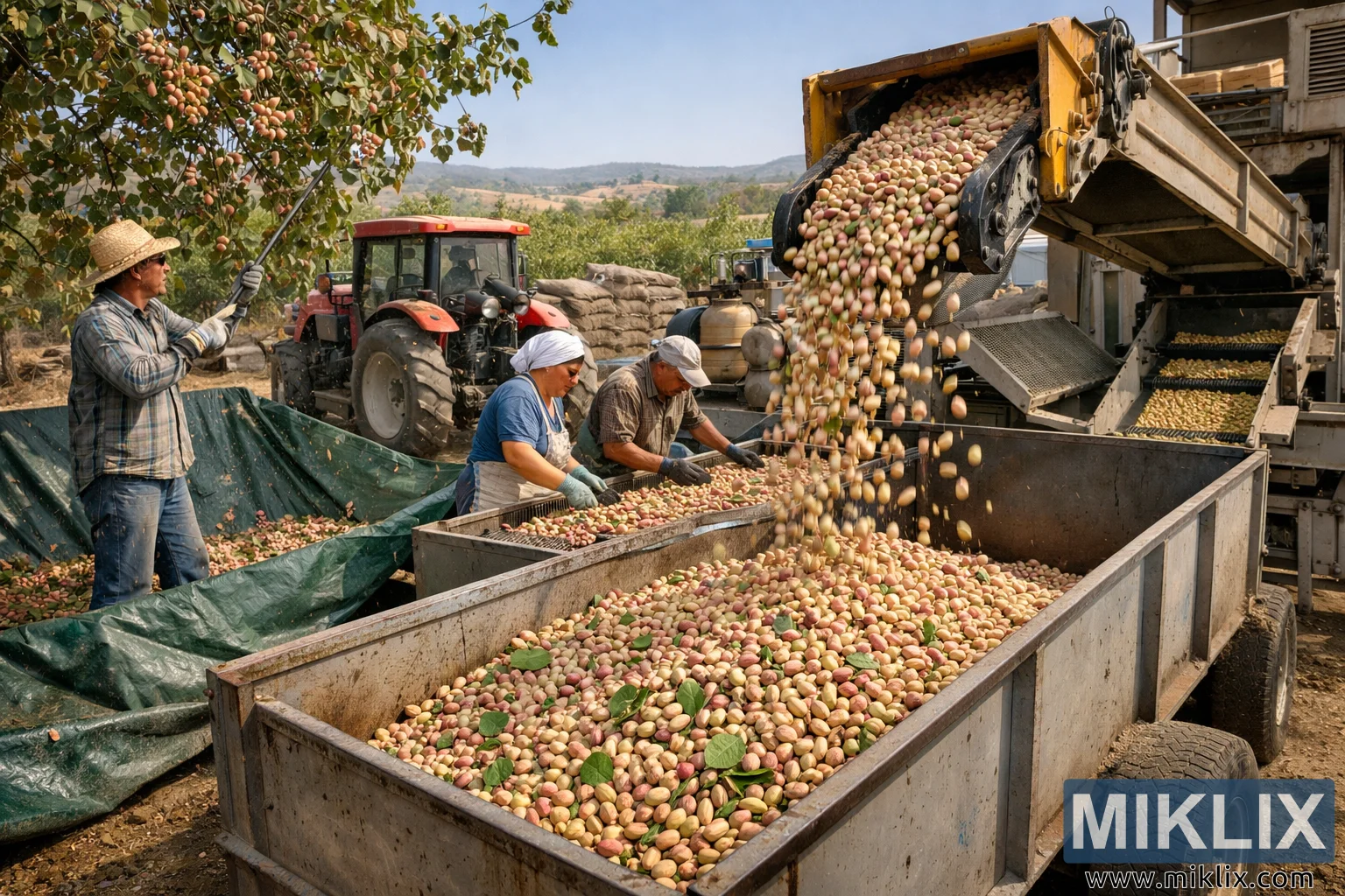 Atrás dos trabalhadores, um trator vermelho está estacionado, acoplado ao equipamento de processamento. As máquinas têm um aspecto industrial e funcional, construídas com painéis de metal, correias e calhas projetadas para o manuseio de grandes volumes de pistaches. Sacos de juta estão empilhados no plano médio, sugerindo etapas posteriores de secagem, armazenamento ou transporte. Ao fundo, fileiras de pomares de pistache se estendem em direção a colinas onduladas, que se perdem na distância sob um céu azul claro. A iluminação é brilhante e natural, projetando sombras nítidas e destacando texturas como poeira, metal, tecido e folhagem. No geral, a imagem apresenta um panorama completo da agricultura de pistache, combinando trabalho humano, mecanização e paisagem em uma narrativa visual coesa e informativa.