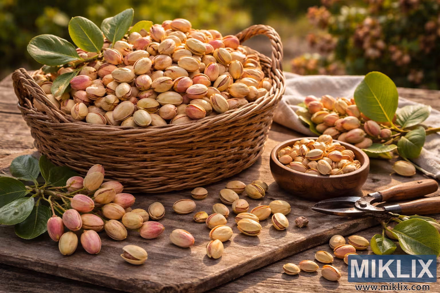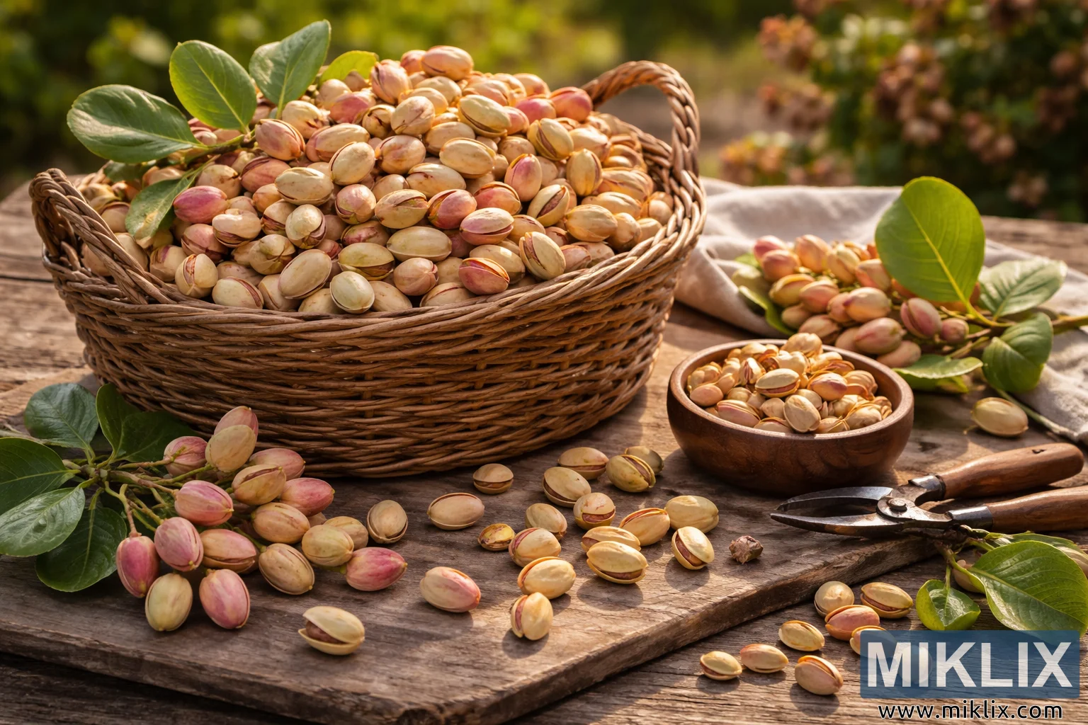 Imagem em alta resolução de pistaches caseiros recém-colhidos, dispostos em uma cesta de vime sobre uma mesa rústica de madeira, rodeados por folhas verdes e ferramentas de jardinagem, sob luz natural e aconchegante.