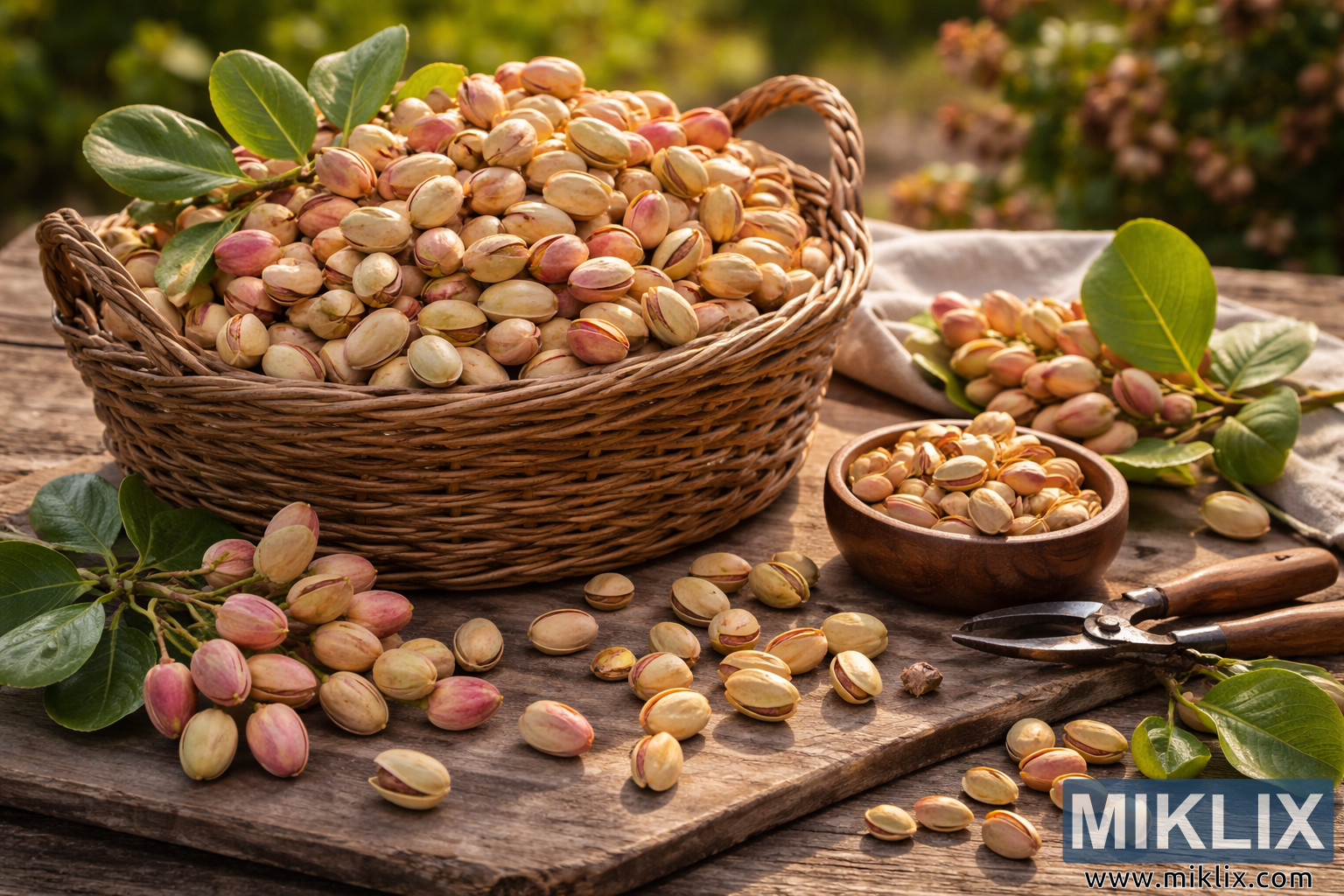 Imagem apresenta uma natureza-morta de alta resolução, em formato paisagem, com pistaches recém-colhidos e cultivados em casa, dispostos em um ambiente externo rústico e acolhedor. No centro da composição, encontra-se uma grande cesta de vime trançado à mão, repleta de pistaches com suas cascas naturais. As cascas exibem suaves degradês de bege claro, rosa blush e castanho claro, muitas delas ligeiramente abertas, revelando vestígios de amêndoas verde-vibrantes em seu interior. A cesta repousa sobre uma mesa de madeira desgastada, cuja textura, pequenas rachaduras e superfície irregular enfatizam uma sensação de antiguidade e autenticidade. Pistaches espalhados caem naturalmente da cesta sobre uma tábua de corte de madeira grossa, colocada em primeiro plano, criando uma atmosfera casual, de colheita recente. À direita da cesta, uma pequena tigela de madeira contém uma porção modesta de pistaches, ecoando o tema principal e, ao mesmo tempo, adicionando equilíbrio à composição. Próximo a ela, uma tesoura de poda de metal com cabos desgastados repousa parcialmente sobre a tábua, reforçando sutilmente o tema da colheita recente e do trabalho manual na jardinagem. Folhas frescas de pistache verde e pequenos cachos de cascas fechadas estão dispostos ao redor da cena, alguns repousando sobre um pano de linho dobrado, outros colocados diretamente sobre a madeira, adicionando formas orgânicas e um toque contrastante de verde. O fundo está suavemente desfocado, sugerindo um jardim ou pomar banhado pela luz do sol do final da tarde. Uma luz quente e dourada ilumina os pistaches e a cesta lateralmente, realçando suas texturas e cores, enquanto projeta sombras suaves que conferem profundidade e realismo à cena. O clima geral é terroso, saudável e abundante, celebrando a simplicidade dos produtos cultivados em casa, a colheita sazonal e uma conexão íntima com a natureza.