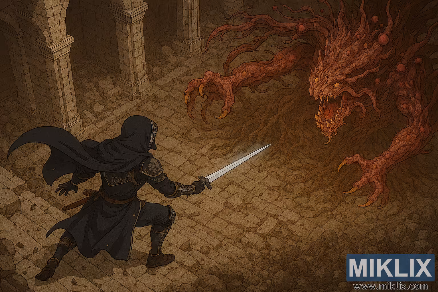 Esta imagem combina a estética do anime com o realismo da fantasia sombria, exibindo ação dinâmica, intensidade emocional e riqueza de detalhes ambientais. Ela evoca temas como coragem, corrupção e a eterna luta entre a luz e a decadência — uma homenagem à brutal beleza do mundo de Elden Ring.