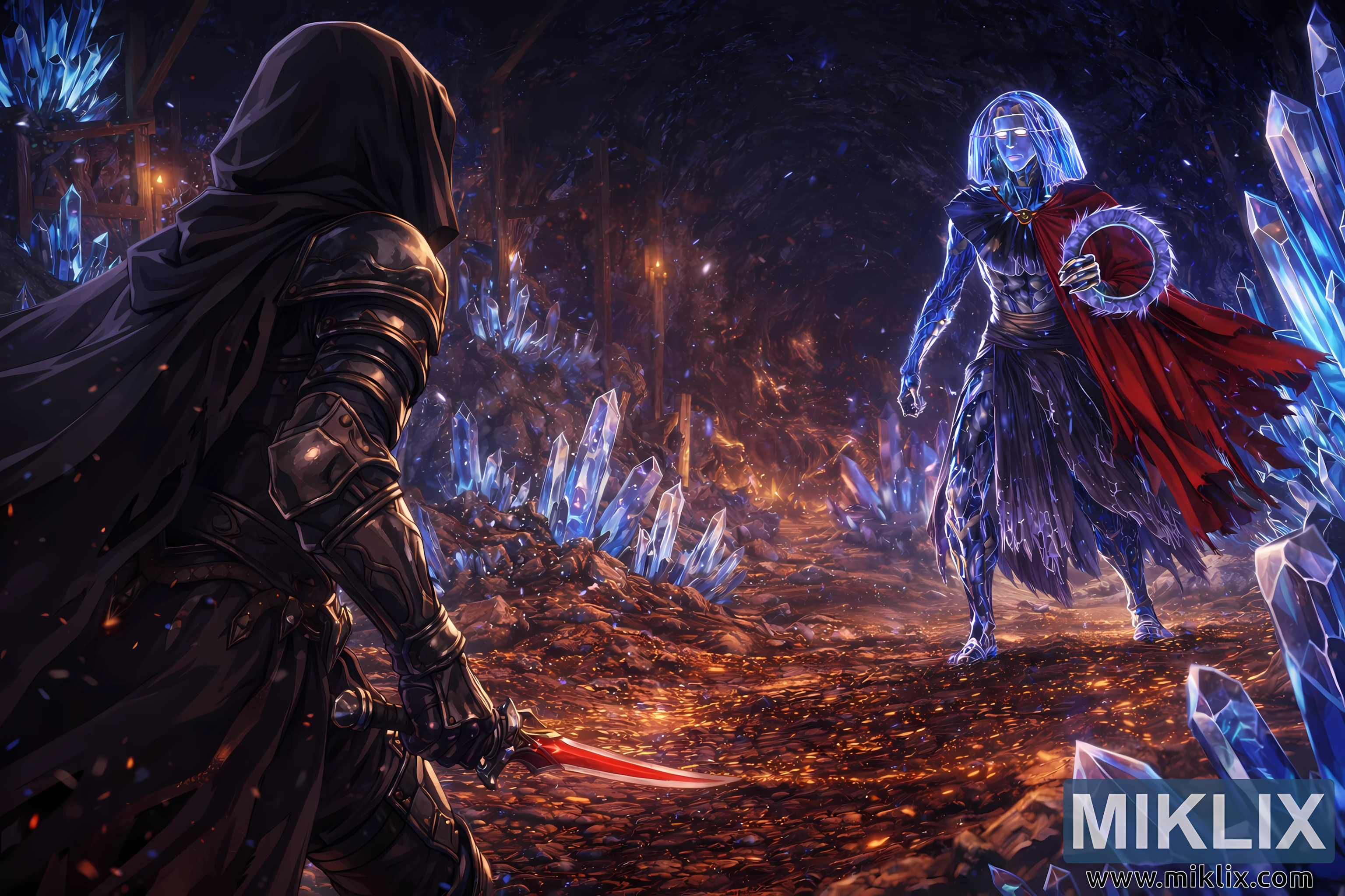O ambiente do túnel emoldura o confronto como uma arena natural. Aglomerados de cristais emergem do solo entre e ao redor das duas figuras, guiando o olhar do espectador para o centro da cena. Vigas de madeira e a tênue luz de tochas ao longe sugerem operações de mineração abandonadas, tomadas por uma vegetação misteriosa. Partículas de poeira e minúsculos fragmentos de cristal pairam no ar, intensificando a sensação de quietude. A atmosfera geral é de tensão contida e expectativa, capturando o momento preciso antes do choque das lâminas e da ruptura do silêncio da caverna com a violência.