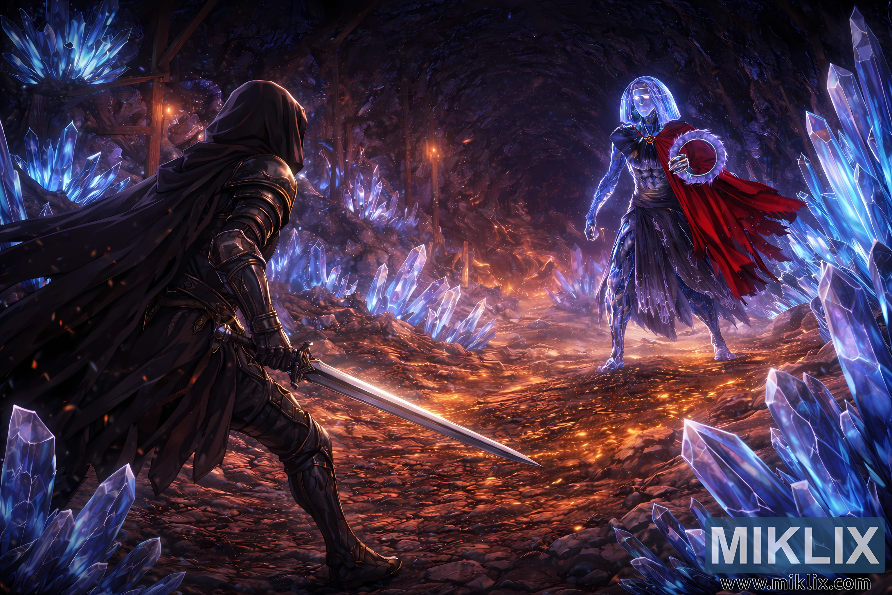 A visão mais ampla revela uma narrativa ambiental mais profunda. Vigas de sustentação de madeira e a tênue luz das tochas recuam para o fundo, vestígios de antigas atividades de mineração abandonadas, agora dominadas pelo crescimento de cristais e forças arcanas. O túnel se curva na escuridão atrás do Cristaliano, adicionando profundidade e mistério. Partículas de poeira e minúsculos fragmentos de cristal pairam no ar, intensificando a quietude antes da explosão de violência. No geral, a imagem captura um momento de tensão contida, onde aço e cristal estão prestes a colidir em um duelo mortal sob a terra.