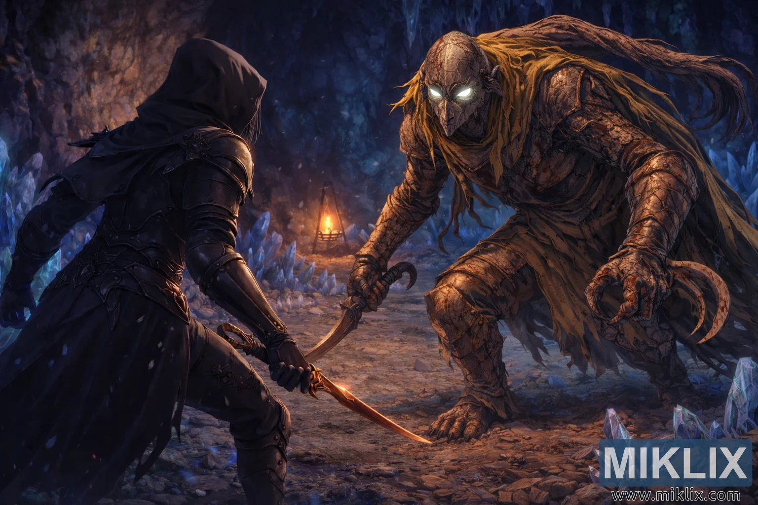 Em primeiro plano à esquerda, encontra-se o Maculado, um guerreiro solitário vestido com a armadura da Faca Negra. A armadura é elegante e escura, absorvendo grande parte da luz ambiente, com sutis reflexos metálicos nas bordas e juntas. Um capuz oculta o rosto do Maculado, adicionando um ar de mistério e determinação. Sua postura é baixa e cautelosa, joelhos flexionados e ombros angulados para a frente, sinalizando prontidão sem se comprometer totalmente com um ataque. Em uma das mãos, o Maculado empunha uma lâmina curta que brilha fracamente com uma luz quente, semelhante a brasas, sua lâmina refletindo tanto a chama da lanterna quanto o brilho frio dos cristais. O tecido esvoaçante da capa arrasta-se atrás dele, congelado em pleno movimento, como se o próprio ar estivesse prendendo a respiração.