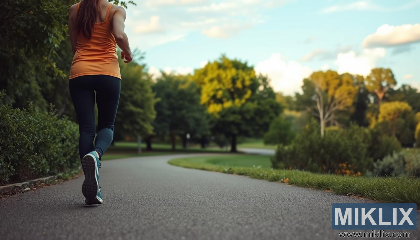 Cena de parque com uma pessoa caminhando rapidamente por um caminho sinuoso, cercada por vegetação exuberante e céu aberto, simbolizando bem-estar e benefícios para o controle de peso.