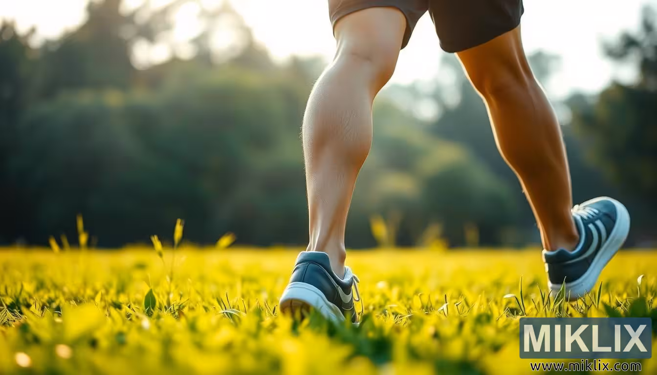 imagem captura um momento incrivelmente dinâmico congelado no tempo: um close-up de uma pessoa caminhando por um campo iluminado pelo sol, com a câmera em um ângulo baixo para destacar a força rítmica de seus passos. O foco está deliberadamente na parte inferior do corpo — pernas e pés calçados com tênis esportivos elegantes —, exibindo a definição muscular e a sutil tensão das panturrilhas à medida que se flexionam e relaxam a cada passo. Essa perspectiva não apenas enfatiza a mecânica física da caminhada, mas também comunica uma narrativa mais profunda sobre resistência, saúde e a determinação silenciosa contida em um ato tão simples. Cada passo parece ecoar força e propósito, reforçando a caminhada como um exercício acessível e uma prática vital para a manutenção do bem-estar a longo prazo.