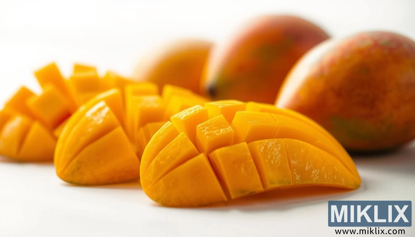 clima geral da imagem é de saúde, vitalidade e indulgência, equilibrados em perfeita harmonia. Os tons laranja-dourados evocam calor, energia e positividade, ecoando os benefícios nutricionais que as mangas proporcionam: ricas em vitaminas, antioxidantes e fibras, proporcionando não apenas sabor, mas também bem-estar. A clareza da fotografia, aliada à suavidade da luz, quase cria uma ilusão sensorial, como se o observador pudesse estender a mão, retirar um cubo da casca e saborear sua doçura derretida. O contraste entre o primeiro plano e o fundo acrescenta uma qualidade artística, combinando o apelo sensual da fotografia de alimentos com uma celebração silenciosa da arte da natureza. Mais do que apenas uma fruta capturada em uma fotografia, a manga aqui se torna um símbolo de abundância tropical, hospitalidade e o prazer atemporal de desfrutar de algo belo e nutritivo.