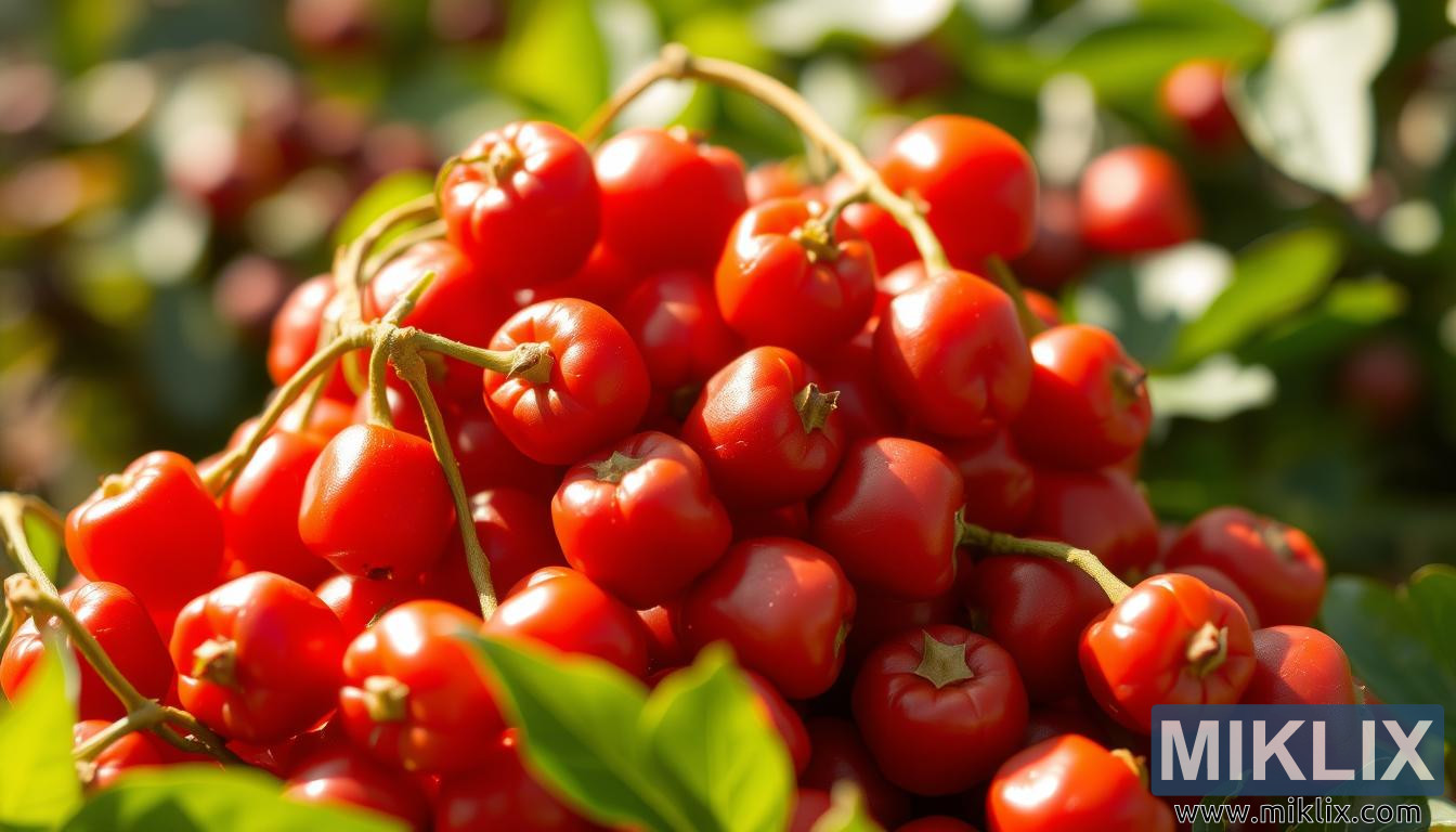 fotografia captura um close-up rico e vívido de um cacho de frutas vermelhas brilhantes e brilhantes que imediatamente chamam a atenção com sua coloração marcante e brilho natural. Cada fruta brilha sob a suave iluminação da luz solar, refletindo um espectro de tons vermelhos que variam do carmesim profundo a tons mais claros onde a luz atinge suas superfícies arredondadas. Sua forma é intrincada e encantadora, com pequenas covinhas e leves sulcos que criam uma sensação de individualidade orgânica, lembrando ao observador que estes são tesouros naturais moldados pelos ritmos de crescimento e do meio ambiente. As frutas estão aninhadas em um arranjo compacto, seus caules entrelaçados como fios do design da natureza, adicionando textura e profundidade à composição. Esse emaranhamento natural reforça a sensação de abundância e vitalidade, um testemunho silencioso da generosidade da terra.