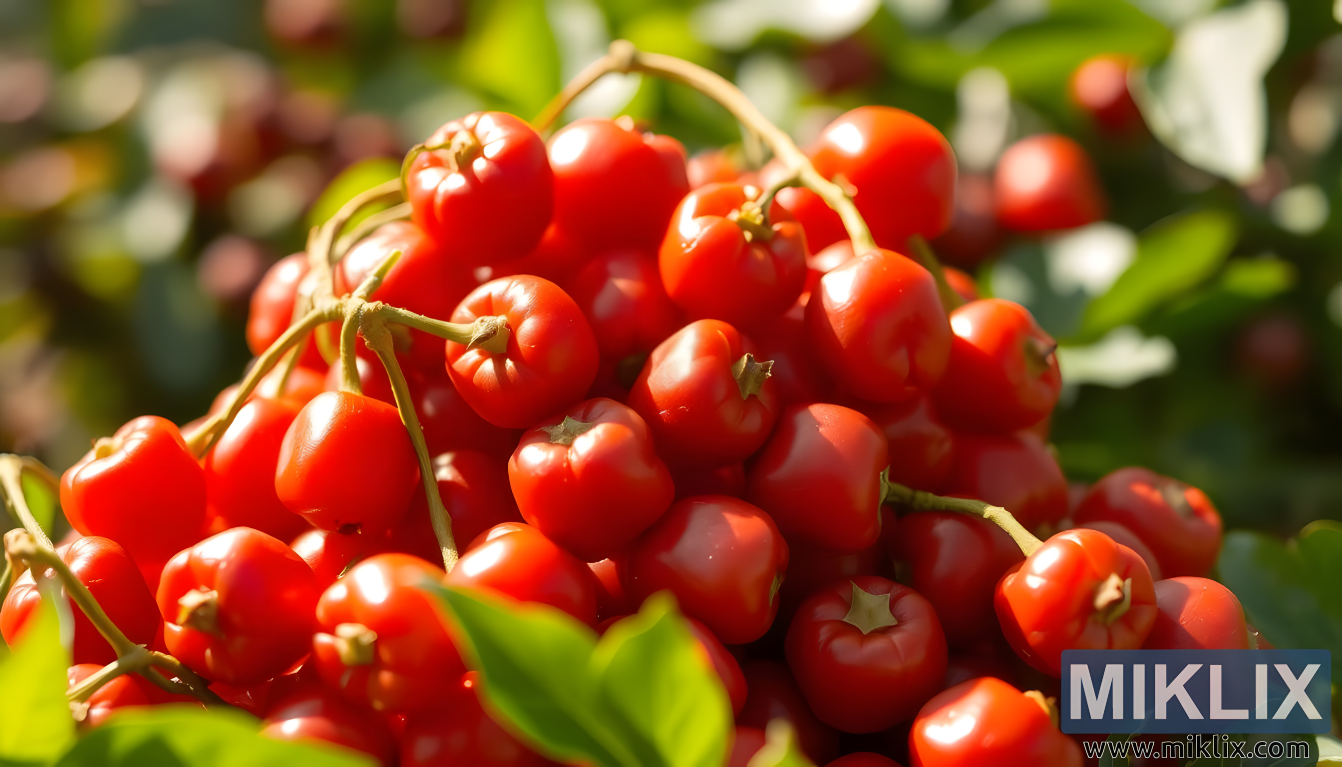fundo, embora desfocado em um bokeh suave, desempenha um papel essencial na amplificação da vibração das próprias frutas. Seu verde exuberante emoldura os tons vermelhos em perfeita harmonia, criando um contraste natural que permite que as frutas brilhem com ainda mais intensidade. As folhas desfocadas e os toques de luz solar filtrada sugerem um pomar ou jardim sereno, um lugar vivo e em crescimento, onde o ar é fresco e quente, e onde cada fruta carrega a promessa de nutrição. Este pano de fundo é mais do que um cenário; torna-se um convite sutil para entrar em um momento de quietude, para sentir a energia silenciosa da natureza capturada em um único quadro. O equilíbrio entre detalhes nítidos e sugestões desfocadas reflete a maneira como a memória funciona, mantendo certos elementos vividamente enquanto permite que outros se desvanecem em uma impressão mais suave.