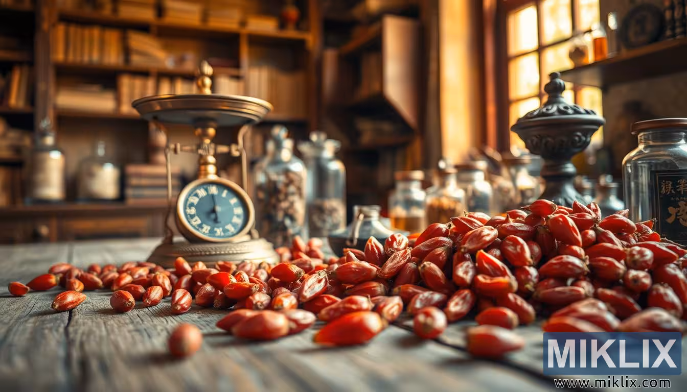 Natureza morta de bagas de goji com balança de latão, ervas e potes antigos em um ambiente de medicina tradicional chinesa, evocando cura, sabedoria e vitalidade.