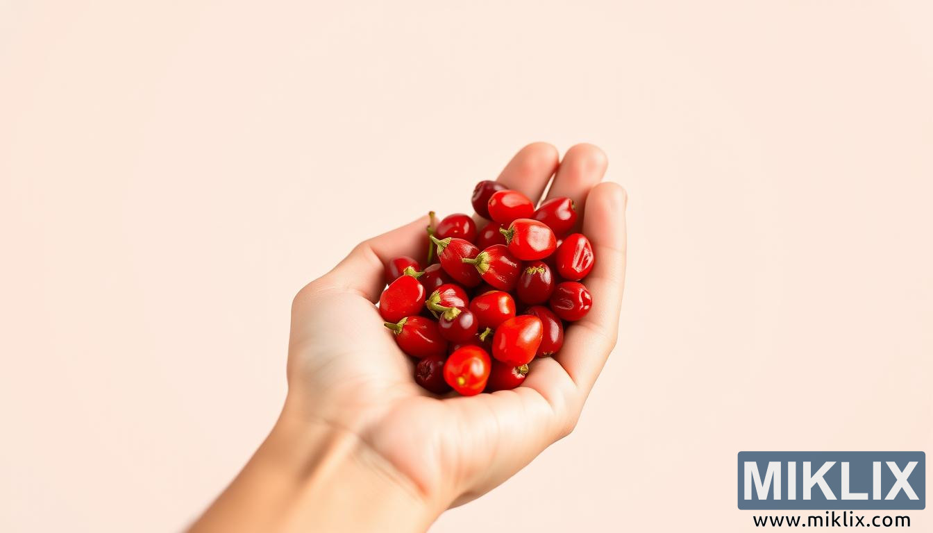 Imagem: Mão segurando bagas de goji frescas