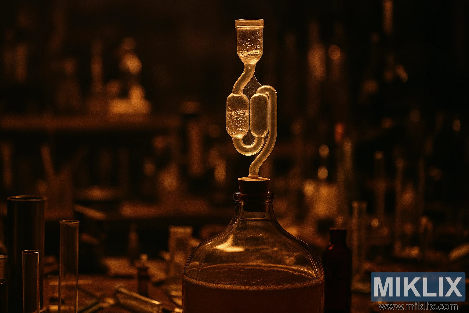 Bubbling Fermentation Lock in Amber-Lit Laboratory
