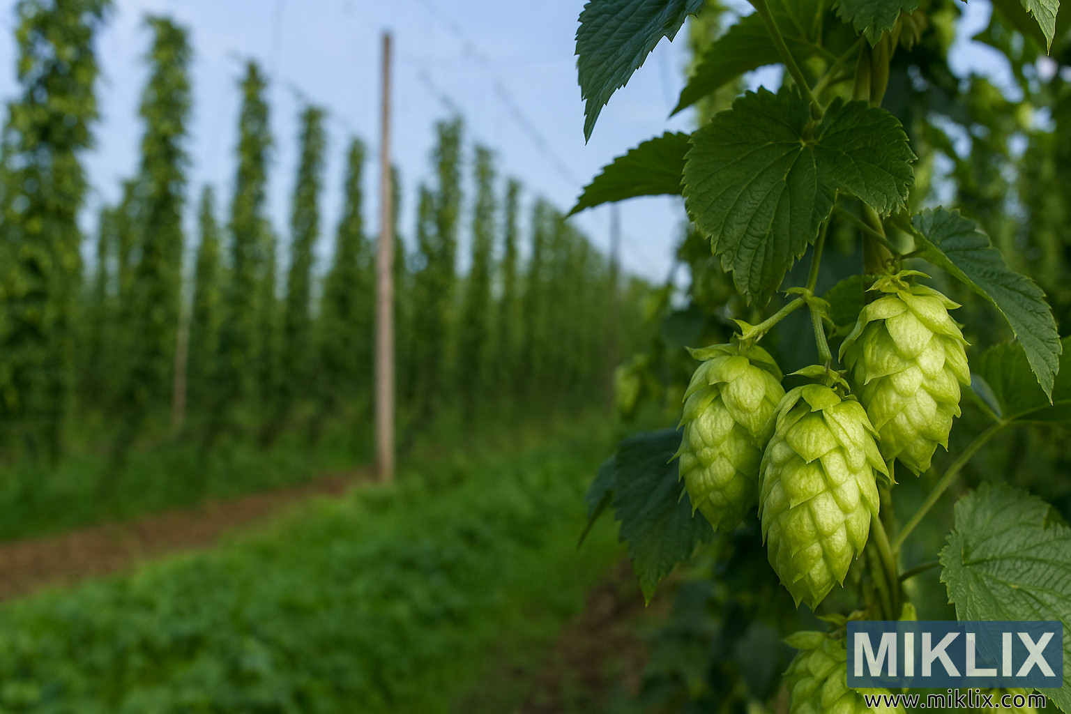 Esta fotografia de paisagem de alta resolução capta um vibrante campo de lúpulo durante a época de crescimento pico, mostrando lúpulo Admiral cultivado em treliças altas sob um céu azul límpido. Em primeiro plano, uma vista aproximada revela um grupo de cones verdes de lúpulo Admiral pendurados numa vinha. Estes cones são proporcionalmente realistas em tamanho, cada um medindo aproximadamente 3–5 cm de comprimento, com brácteas sobrepostas e compactas que formam uma estrutura semelhante a uma pinha. O seu tom verde-pálido contrasta com as folhas verde-escuras que os rodeiam, que são largas, serrilhadas e com veias, típicas da espécie Humulus lupulus.