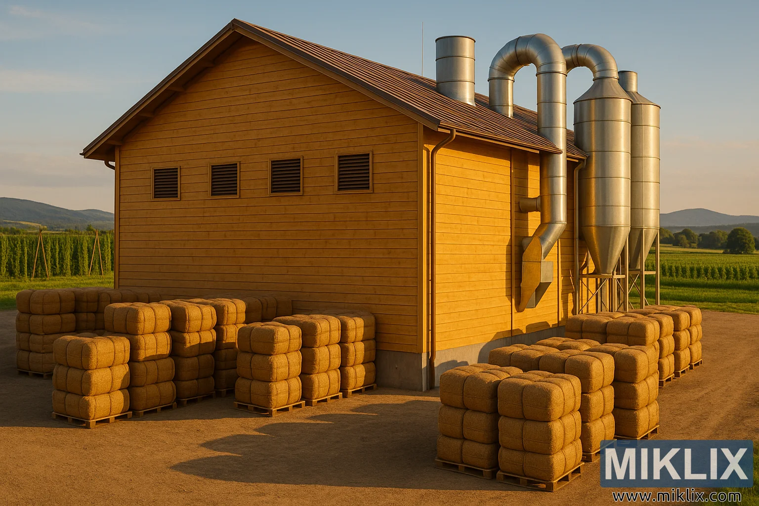A imagem retrata uma instalação de armazenamento de lúpulo capturada sob a luz solar quente do final da tarde, apresentando um equilíbrio harmonioso entre tradição rústica e eficiência agrícola moderna. Tirada de uma perspetiva ligeiramente elevada e grande-angular, a cena permite que o espectador aprecie tanto os detalhes arquitetônicos da instalação quanto sua paisagem circundante.