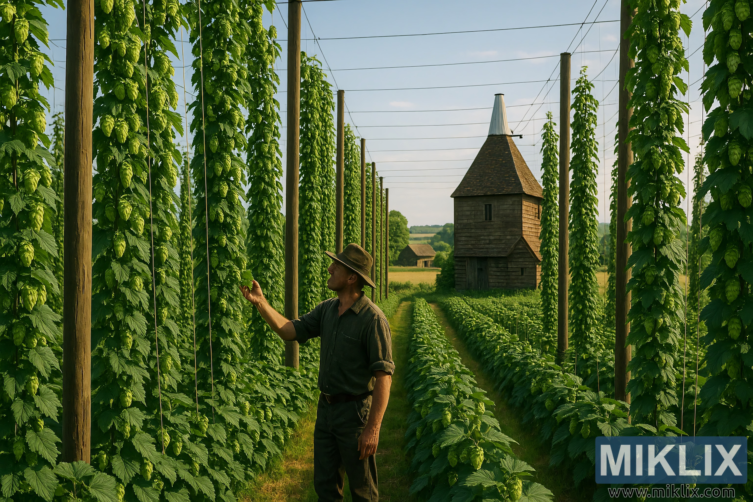 Um verdejante campo de lúpulo de Ringwood com uma fazenda inspecionando cones, contra colinas ondulantes, um forno de madeira e um tranquilo cenário campestre inglês.