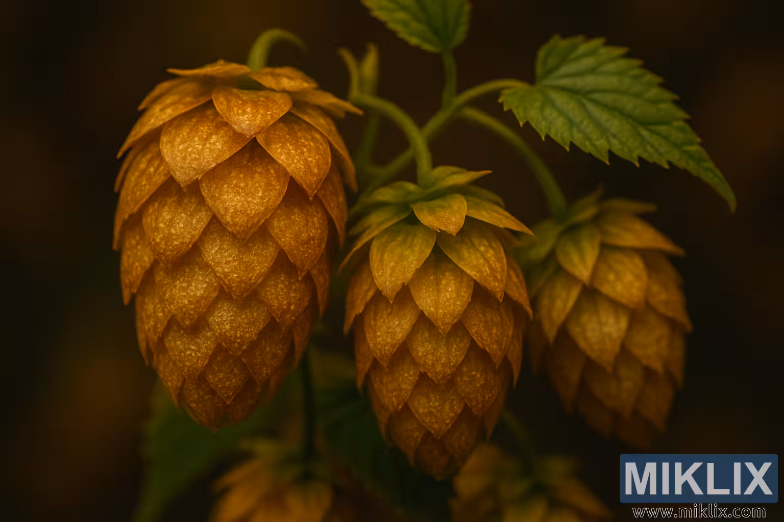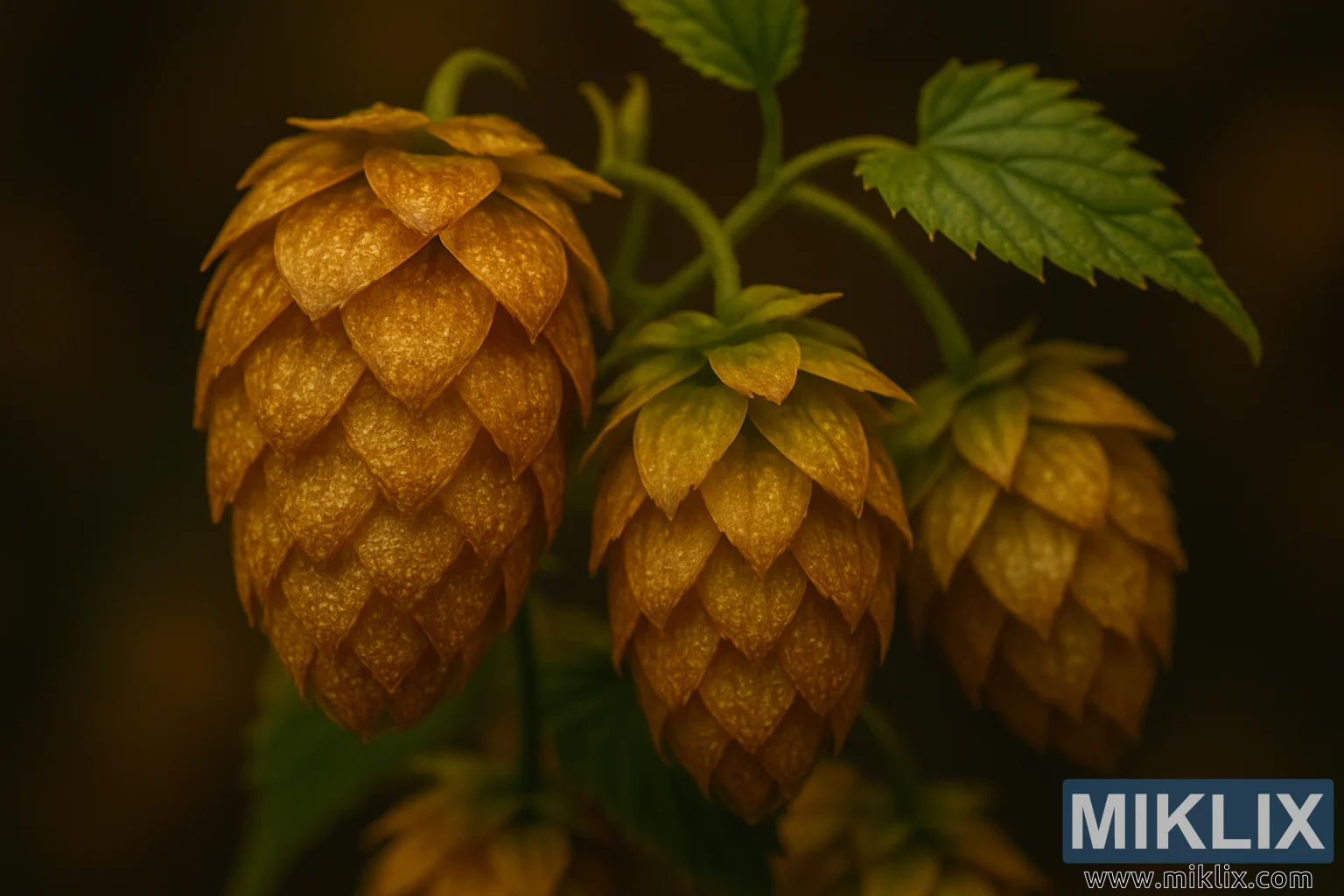 Em primeiro plano, as intrincadas escalas dos cones são mostradas em foco nítido, permitindo que o espectador aprecie sua beleza em camadas, quase arquitetônica. A interação entre luz e sombra chama a atenção para o contraste textural entre as camadas externas de papel e a lupulina interior brilhante e rica em óleo. Os tons quentes de âmbar dourado são dominantes, simbolizando tanto o amadurecimento literal dos cones quanto sua riqueza figurativa como ingredientes cervejeiros apreciados. As pistas visuais convidam não apenas à inspeção, mas também à imaginação dos aromas – terrosos, resinosos e ligeiramente cítricos – emanados da planta.