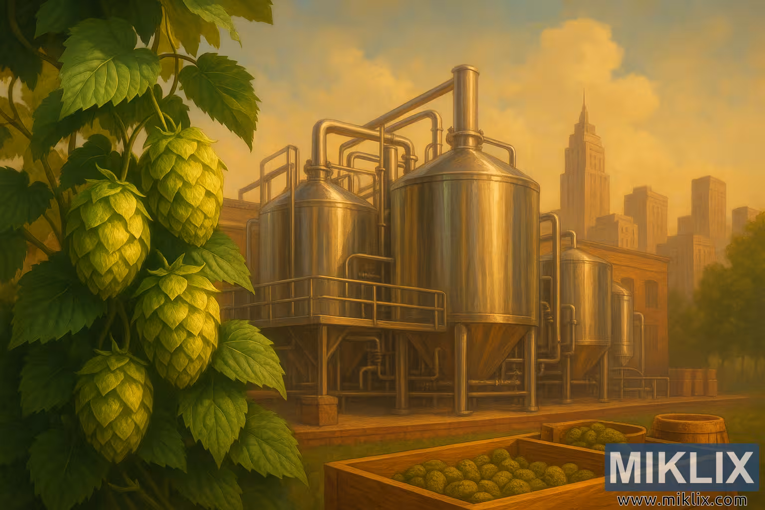 A imagem é uma cena vívida e ricamente composta que celebra a proeminência histórica e contínua da variedade de lúpulo Super Pride dentro da indústria cervejeira. Ele combina elementos naturais, industriais e urbanos em uma narrativa coesa, cada camada simbolizando um capítulo diferente do legado do lúpulo.