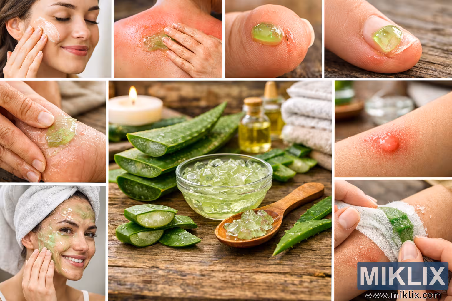 A imagem é uma fotografia composta ampla, orientada para paisagem, que explica visualmente as muitas utilizações do gel de aloe vera para cuidados de pele e primeiros socorros básicos. No centro da composição encontra-se uma natureza-morta natural disposta numa superfície rústica de madeira, com folhas de aloe vera recém-cortadas com o seu gel translúcido exposto, uma taça de vidro transparente cheia de cubos de gel de aloe brilhante e uma pequena colher de madeira que contém uma parte do gel. A luz suave e natural realça a textura húmida e a cor verde pálida da aloé, reforçando uma sensação de frescura, pureza e bem-estar natural. À volta desta natureza-morta central encontram-se várias cenas menores que demonstram aplicações práticas e quotidianas da aloé vera. Uma cena mostra uma mulher a aplicar suavemente gel de aloé no rosto, sugerindo o uso como hidratante facial calmante ou tratamento de cuidados de pele calmantes. Outro close-up mostra gel de aloe a ser espalhado sobre pele avermelhada e queimada pelo sol, enfatizando as suas propriedades refrescantes e calmantes após a exposição ao sol. Imagens adicionais de detalhe focam-se em primeiros socorros, incluindo gel de aloe aplicado num pequeno corte ou abrasão, aloe a aliviar uma queimadura ligeira ou zona irritada da pele, e aloe usada em calcanhares rachados para restaurar a humidade e a suavidade. Uma imagem mostra o gel de aloe colocado sob uma ligeira ligadura, reforçando o seu papel nos cuidados básicos das feridas e na proteção da pele. As pessoas mostradas parecem relaxadas e confortáveis, com expressões calmas e poses naturais que transmitem alívio e cuidado gentil em vez de urgência médica. A paleta de cores geral combina tons quentes de madeira com verdes frescos e tons naturais de pele, criando uma estética equilibrada e orgânica. A composição é limpa e educativa, adequada para saúde, bem-estar ou cuidados naturais da pele, e transmite a versatilidade da aloe vera como remédio vegetal para hidratar, aliviar irritações, tratar lesões ligeiras e apoiar a saúde diária da pele.