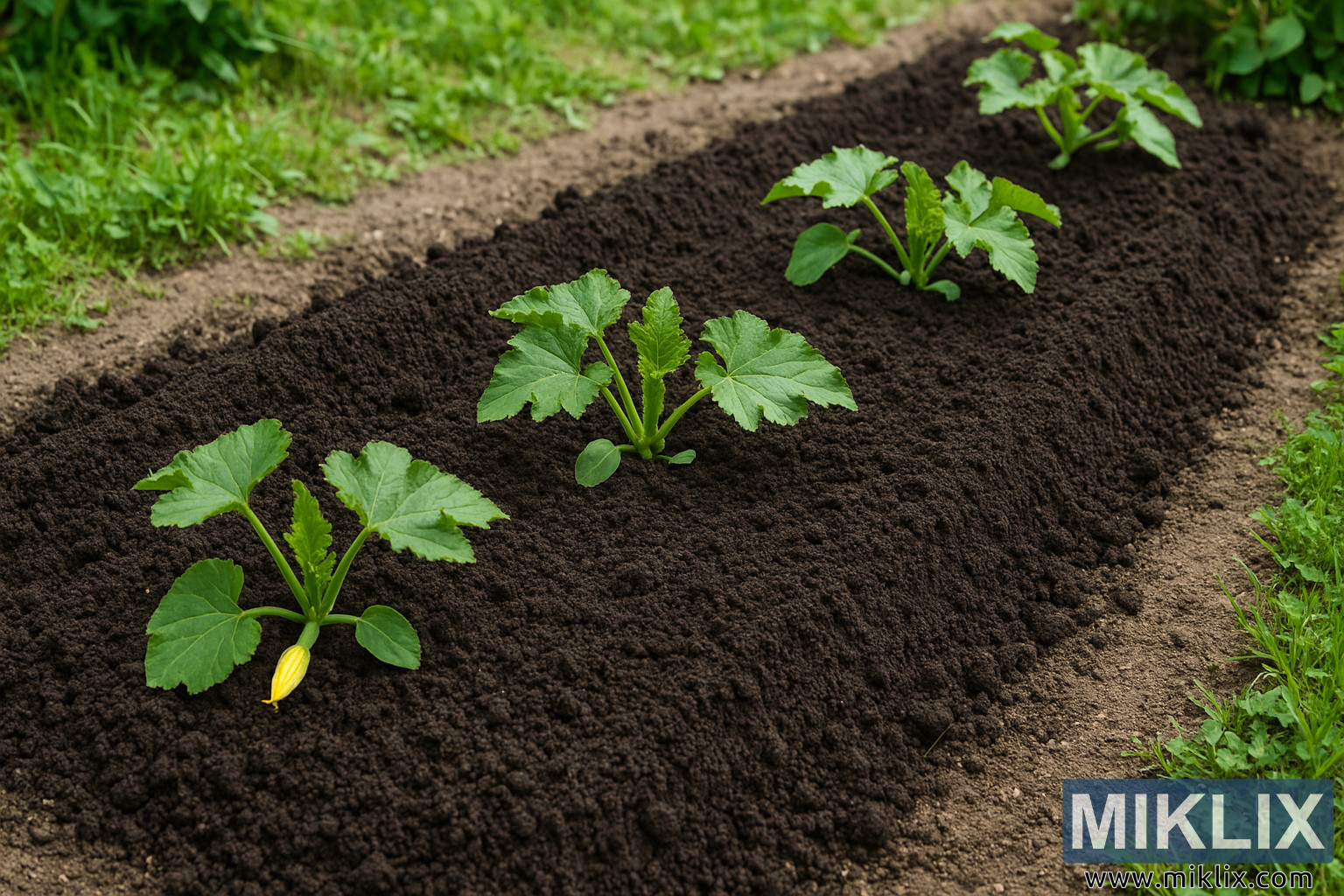 Um canteiro bem preparado, com solo escuro e rico e plantas jovens de curgete, que demonstra um crescimento precoce saudável num ambiente exterior exuberante.