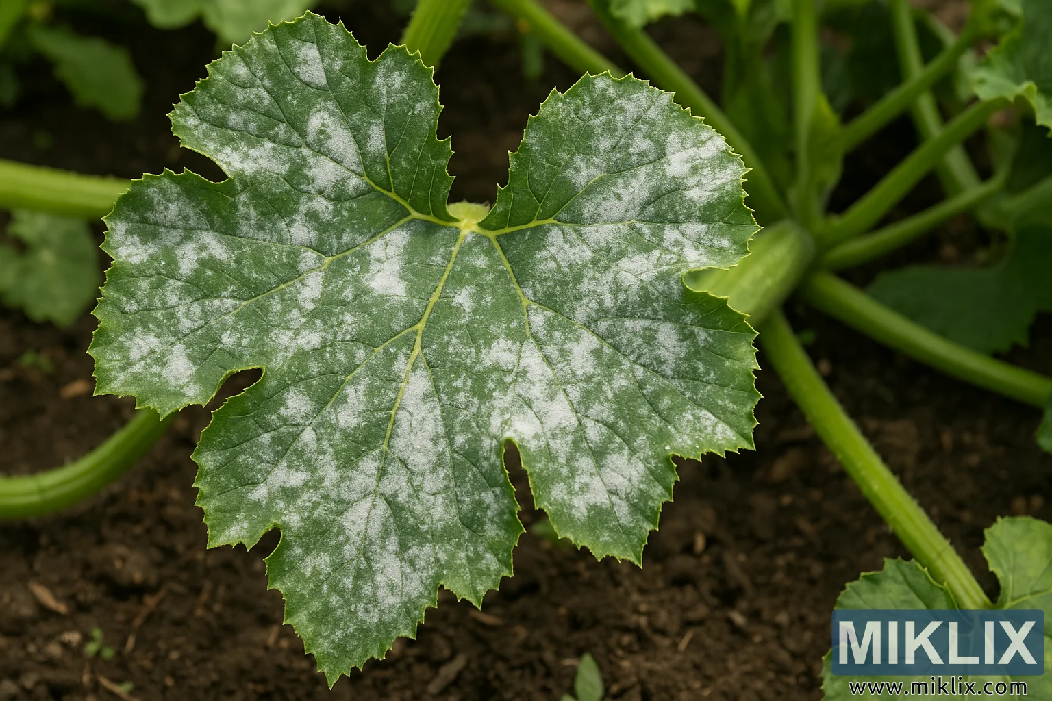 Imagem de alta resolução em close-up de uma folha de curgete infetada com oídio, mostrando manchas fúngicas brancas detalhadas contra um fundo natural de jardim.