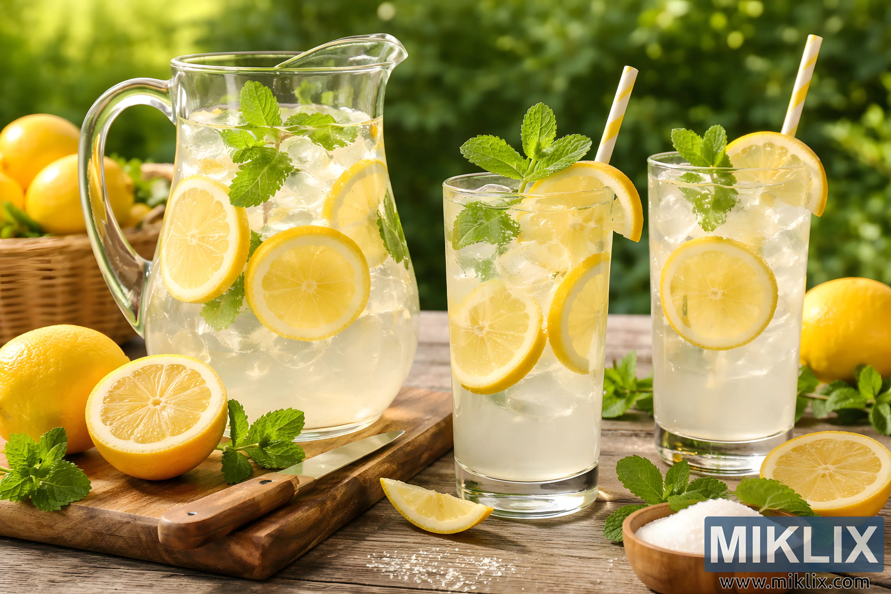 Uma natureza morta luminosa e convidativa apresenta limonada caseira disposta ao ar livre, numa mesa rústica de madeira, captada pela luz natural do dia. No centro da composição está um jarro de vidro transparente cheio de limonada amarelo pálido, repleto de cubos de gelo de formas irregulares que brilham ao apanhar a luz. Fatias finas e redondas de limão fresco flutuam dentro do jarro, a sua polpa translúcida e as cascas vibrantes claramente visíveis através do vidro. Ramos de hortelã verde fresca sobressaem do gelo, acrescentando aroma e frescura. À direita do jarro estão dois copos altos e cilíndricos, cada um cheio da mesma limonada gelada. Fatias de limão são pressionadas contra as paredes interiores dos copos, e pequenas folhas de hortelã repousam por cima do gelo. Um dos copos apresenta uma palhinha de papel às riscas, reforçando um ambiente casual e veraniego. A condensação nas superfícies do vidro sugere subtilmente a temperatura fria da bebida. Em primeiro plano, uma tábua de cortar de madeira contém limões inteiros e um limão cortado ao meio, com o seu interior suculento voltado para o espectador. Uma pequena faca de cozinha repousa ao lado da fruta cortada, sugerindo preparação recente. Perto dali, uma pequena tigela de madeira cheia de cristais de açúcar branco grosseiro está sobre a mesa, com alguns grãos espalhados naturalmente à sua volta. Fatias adicionais de limão e folhas de hortelã são colocadas de forma solta na mesa, contribuindo para uma estética autêntica e caseira. Ao fundo, um cesto de vime cheio de limões é parcialmente visível, enquanto folhagem verde de foco suave cria um ambiente exuberante de jardim. A pequena profundidade de campo desfoca suavemente o fundo, mantendo a atenção na limonada e nos ingredientes. No geral, a imagem transmite refresco, simplicidade e conforto de verão, enfatizando ingredientes naturais, preparação caseira e um ambiente descontraído ao ar livre.