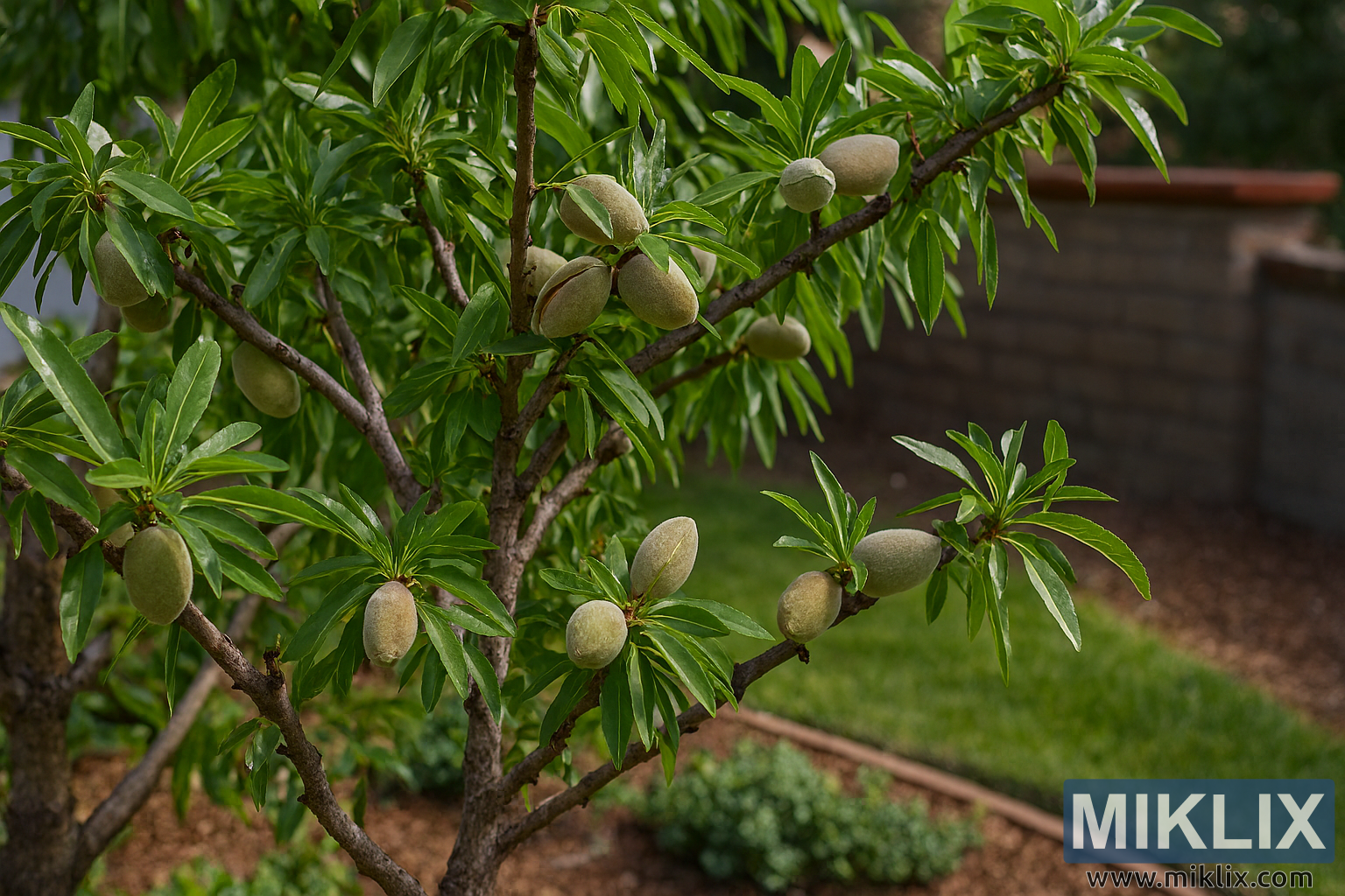 Imagem de alta resolução de uma amendoeira All-In-One com frutos secos a crescer num exuberante jardim doméstico, ideal para uso educativo e hortícola.