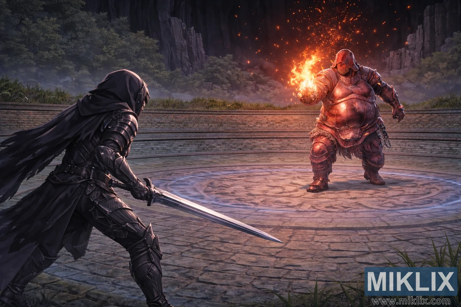 Esta ilustração de fan art ao estilo anime apresenta uma visão alargada e cinematográfica de um tenso impasse pré-batalha dentro da Guarda Eterna do Malefactor, de Elden Ring. A câmara é puxada para trás para revelar mais do ambiente, permitindo que a arena circular de pedra e os seus arredores tenham um papel mais forte na composição. O chão da arena é pavimentado com blocos de pedra gastos dispostos em padrões concêntricos, com runas e sigilos a brilhar tenuemente gravados no círculo central. Muros baixos e sobrepostos de pedra rodeiam a arena, enfatizando a função do Evergaol como campo de batalha selado e prisão arcana. Para lá das muralhas, faces rochosas íngremes e irregulares erguem-se, intercaladas com manchas de árvores densas e sombrias e arbustos. Um céu pesado e escuro ergue-se por cima, os seus tons suaves de carvão e vermelho profundo contribuem para o ambiente opressivo e sobrenatural.