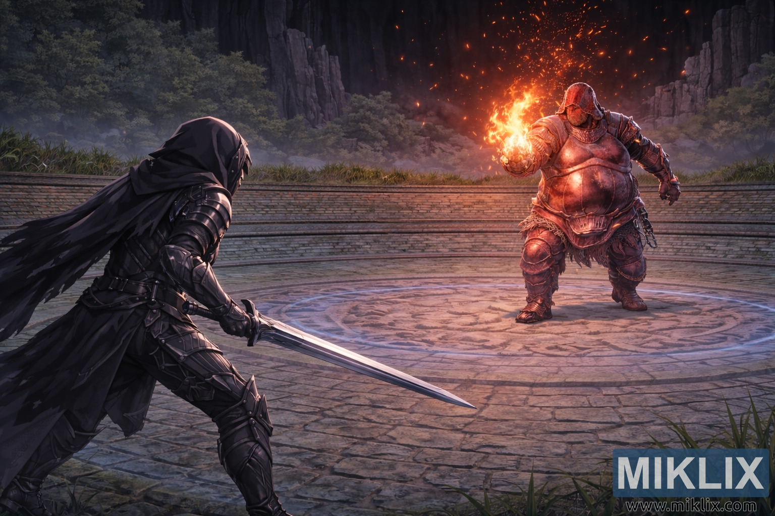 Em frente ao Maculado, do lado direito da arena, está Adan, Ladrão de Fogo. A sua estrutura robusta e armadura pesada dominam o seu lado da composição. A armadura parece queimada, amolgada e manchada de vermelhos profundos e tons de aço escurecidos, sugerindo visualmente uma vida moldada pelo fogo e pela violência. Um capuz cobre-lhe parte do rosto, mas a postura agressiva e a expressão sombria são inconfundíveis. Adan levanta um braço, conjurando uma bola de fogo flamejante que arde intensamente em tons de laranja e amarelo. Faíscas e brasas espalham-se para cima e para fora, iluminando a sua armadura e lançando brilhos tremeluzentes pelo chão de pedra.