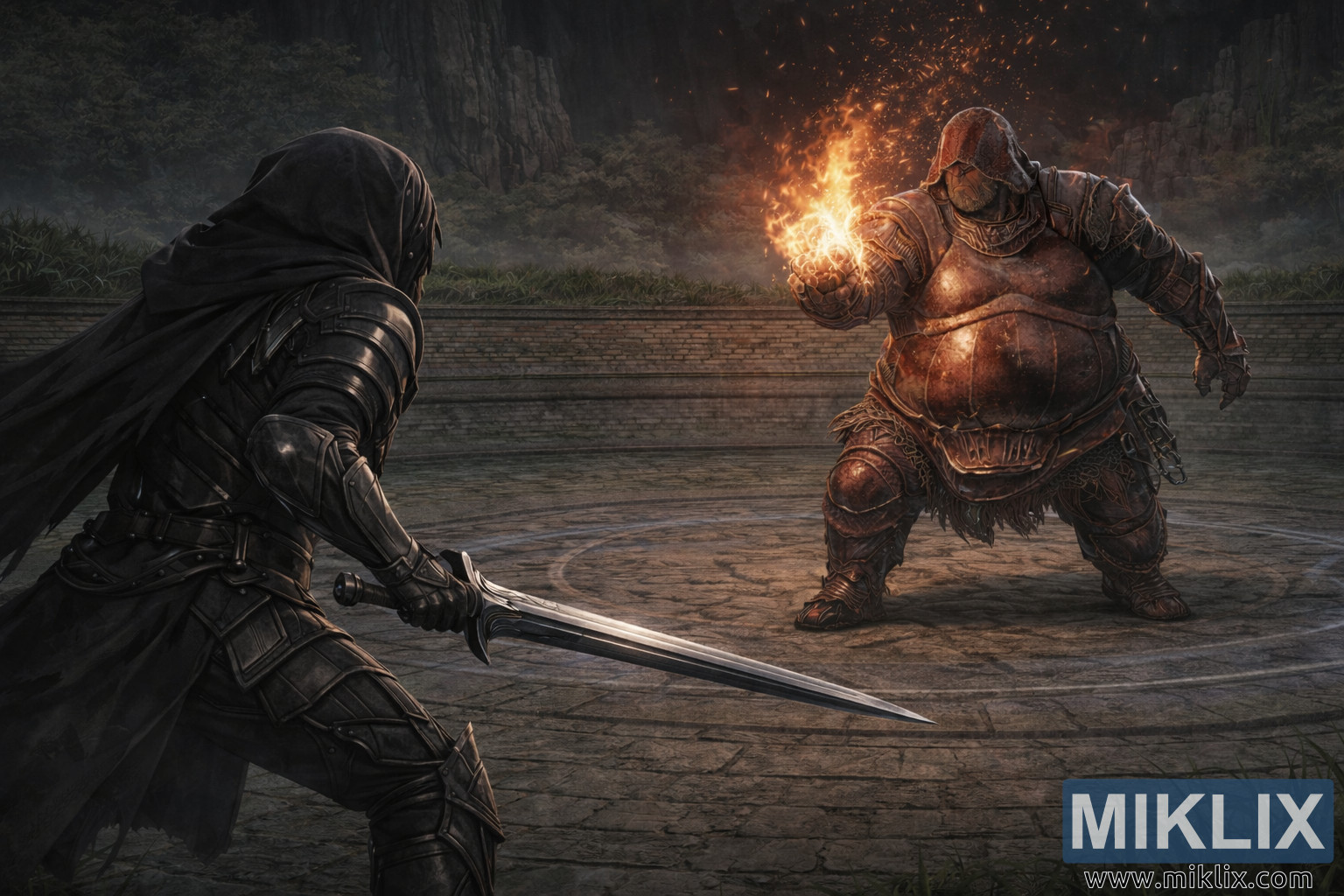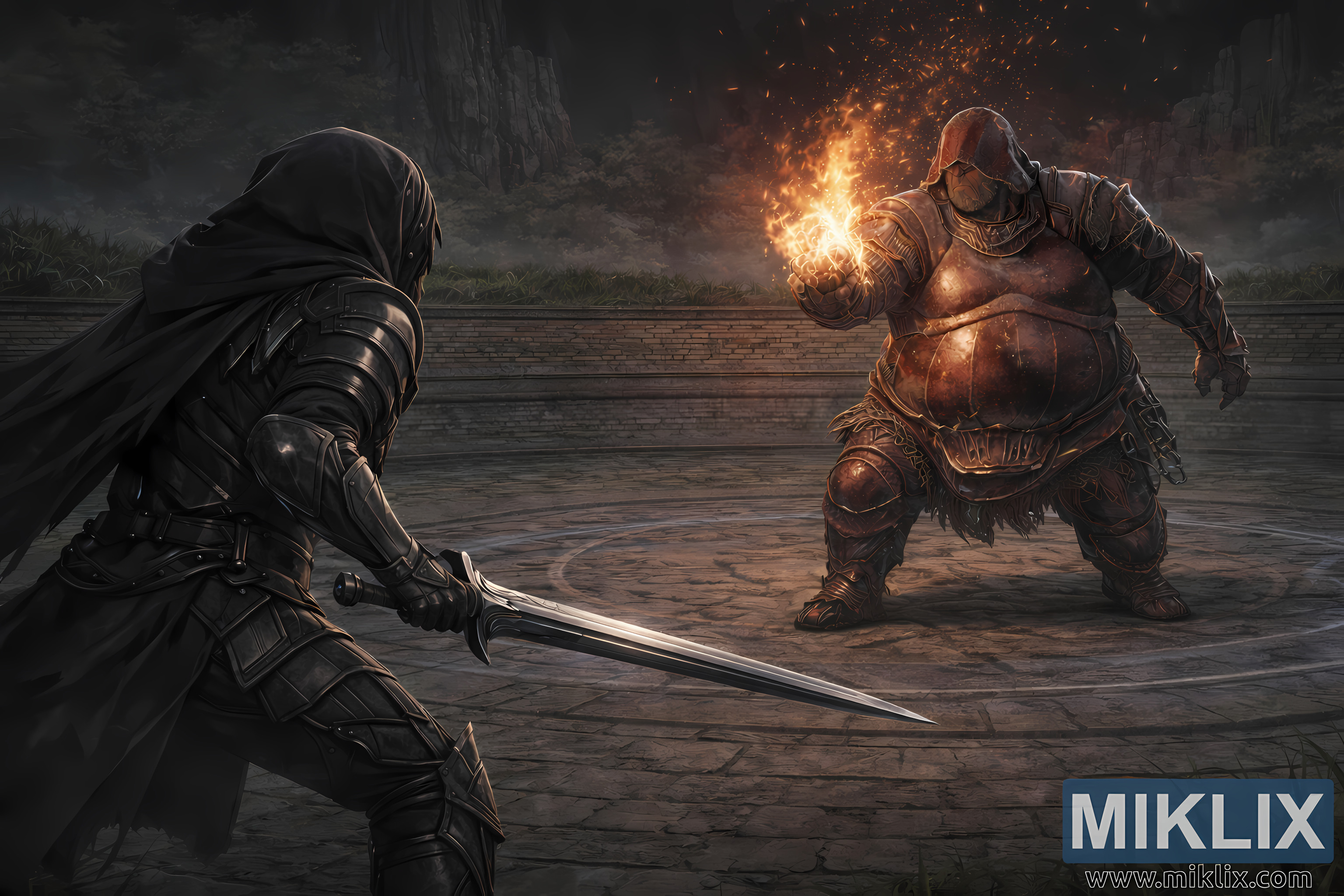 Frente ao Maculado de perto está Adan, Ladrão de Fogo, cuja presença imponente domina o lado direito da arena. A armadura pesada de Adan parece danificada e chamuscada, com tons castanho-vermelhos profundos e aço escurecido que sugerem exposição prolongada ao calor e à batalha. As superfícies da armadura são irregulares e amolgadas, dando uma sensação de massa e idade. O capuz cobre-lhe parcialmente o rosto, revelando uma expressão sombria e endurecida. Adan estende um braço para a frente, conjurando uma bola de fogo que arde intensamente mas de forma realista, as suas chamas lançando uma luz irregular e trémula em vez de um brilho exagerado. Faíscas e brasas sobem, iluminando brevemente o chão de pedra e as extremidades inferiores da sua armadura.