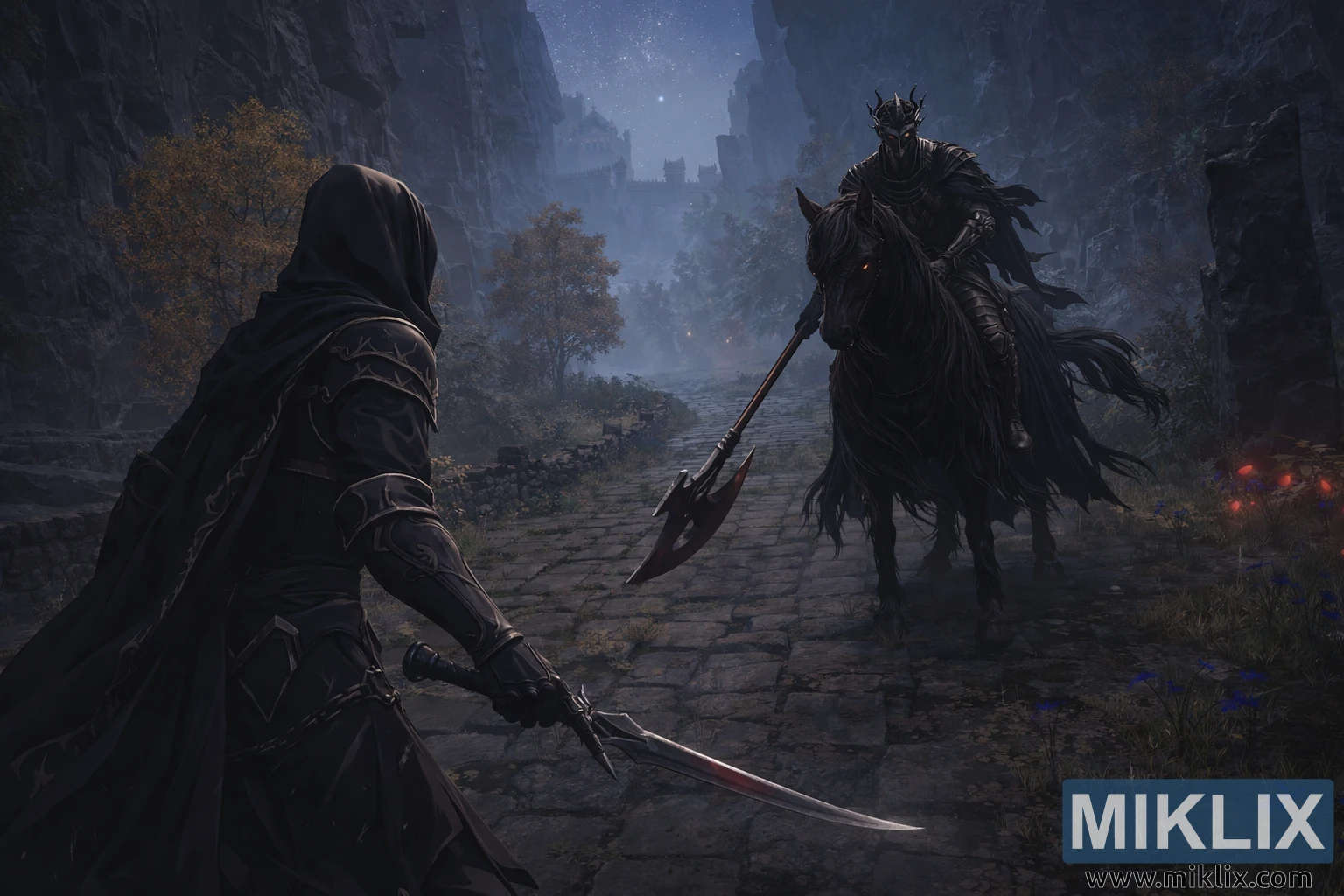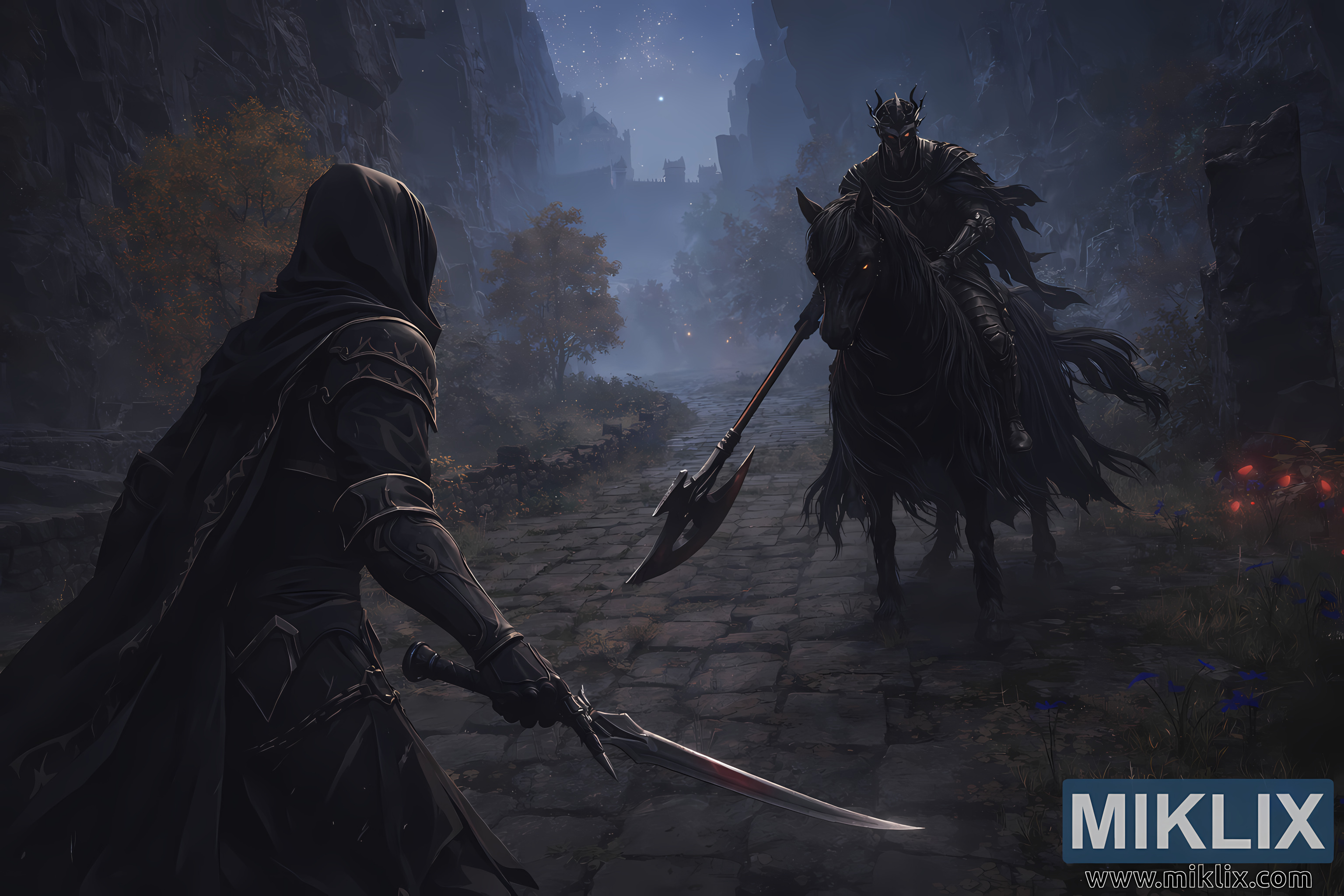 A composição centra-se no espaço vazio entre as duas figuras, transformando a própria estrada num campo de batalha simbólico. Nenhuma das personagens se comprometeu ainda com o primeiro golpe, e o momento parece suspenso no tempo. A iluminação subtil contrasta com a luz fria azul da lua com tons mais quentes e terrosos da folhagem e pedra circundantes, guiando o olhar do espectador para o inevitável confronto. No geral, a imagem transmite uma poderosa sensação de medo, determinação e intensidade silenciosa, captando a icónica atmosfera de Elden Ring no exato instante antes do início do combate.