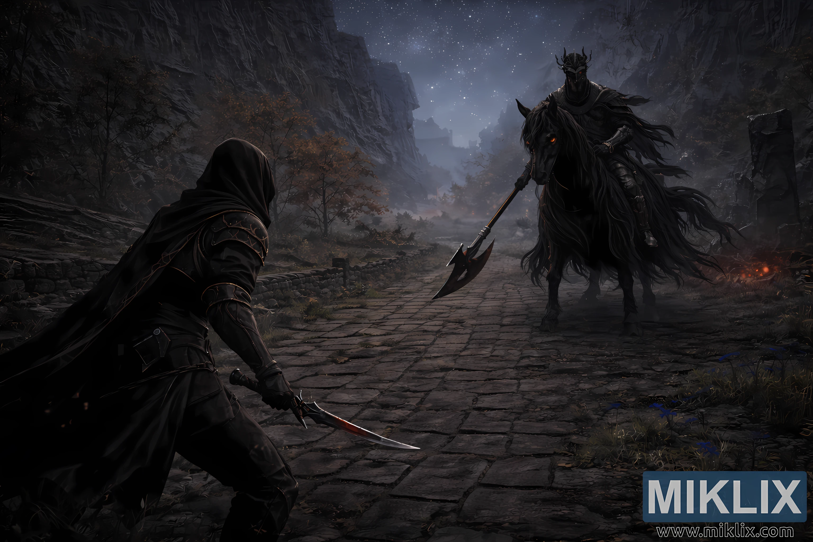 No lado direito da moldura ergue-se a Cavalaria da Noite, propositadamente maior em escala e dominando a composição. Montado num enorme cavalo preto, o chefe exala uma presença avassaladora. O cavalo parece quase antinatural, a sua crina e cauda pesadas penduradas como sombras vivas, os seus olhos vermelhos brilhantes a perfurar a névoa e a escuridão com foco predatório. A Cavalaria da Noite usa armaduras pesadas e angulares em pretos foscos e tons de aço escuro que absorvem a luz em vez de a refletir. Um elmo com cornos coroa o cavaleiro, criando uma silhueta demoníaca e austera contra o céu noturno. A alabarda da Cavalaria é segurada na diagonal, o seu peso evidente no aperto relaxado mas pronto, com a lâmina a pairar logo acima da estrada de pedra como se fosse contida apenas pela disciplina.