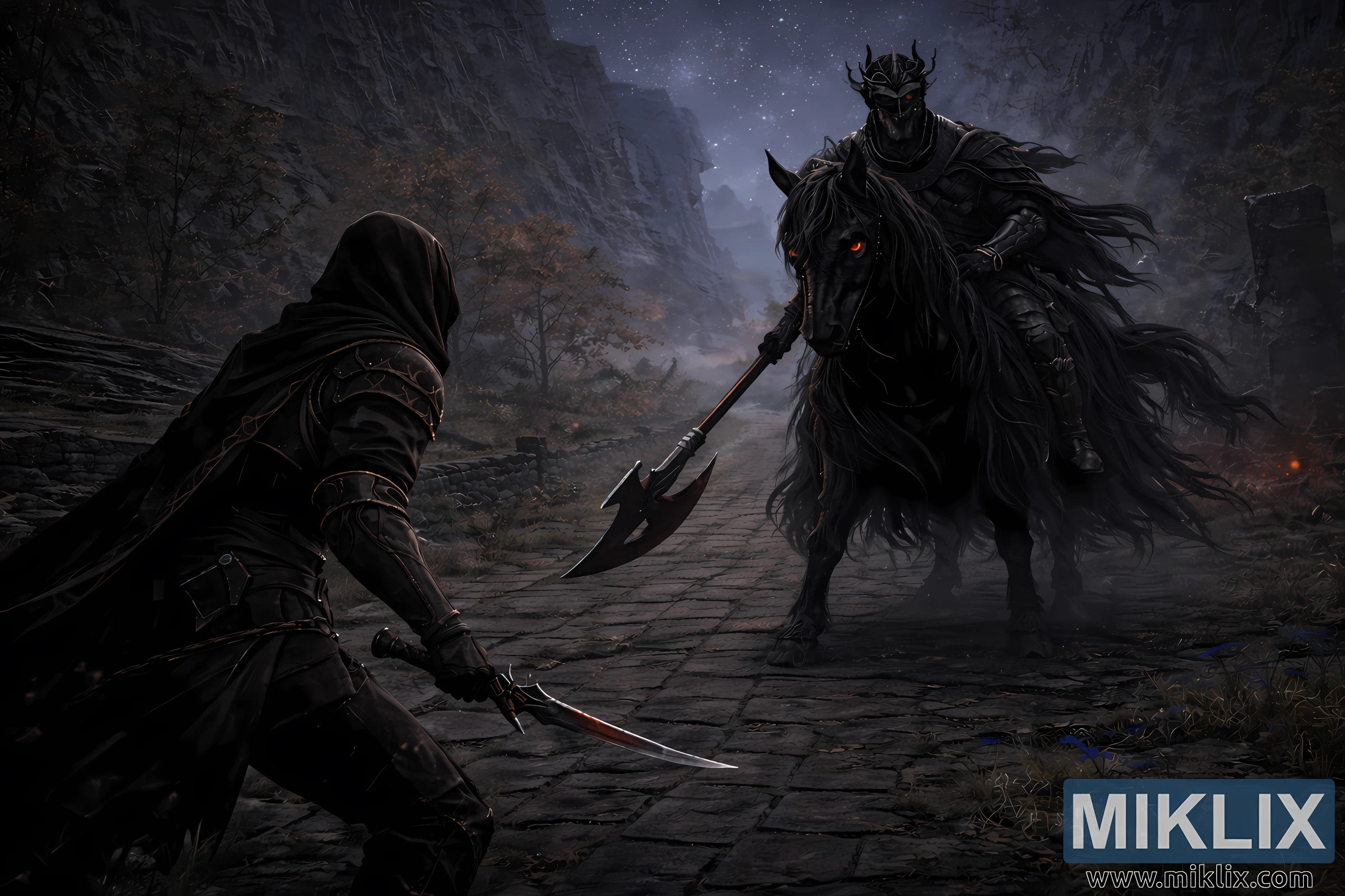 No lado direito da moldura, agora muito mais perto dos Maculados, ergue-se a Cavalaria da Noite. O boss domina a composição pela pura massa e proximidade. Montada num enorme cavalo preto, a Cavalaria parece quase ao alcance do ataque. O cavalo parece antinatural e pesado, a sua longa crina e cauda penduradas como sombras vivas, os seus olhos vermelhos brilhantes a queimar a névoa com intenção predatória. A armadura da Cavalaria da Noite é espessa e angular, mate e escura, absorvendo a luz em vez de a refletir. Um elmo com cornos coroa o cavaleiro, criando uma silhueta demoníaca e austera que parece opressiva a esta distância reduzida. A alabarda é mantida baixa e à frente, inclinada para o Maculado, a sua lâmina pairando logo acima da estrada de pedra, sugerindo que o próximo movimento pode ser fatal.