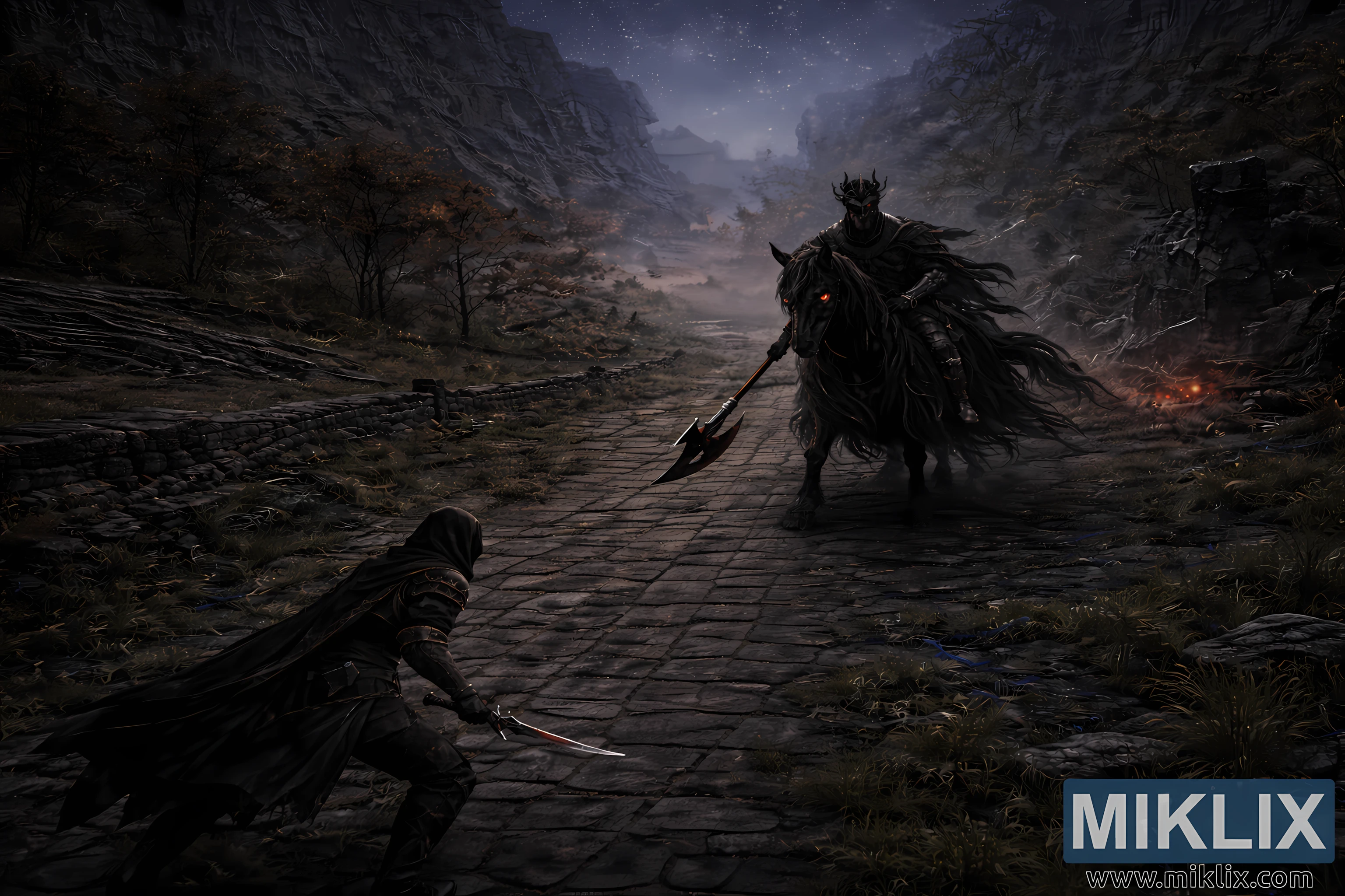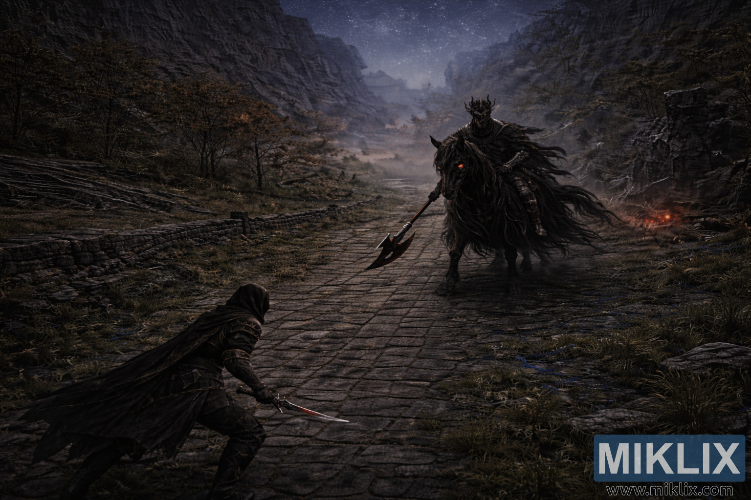Do lado direito da estrutura, mais perto do que antes mas ainda separado por um troço tenso de estrada, está a Cavalaria da Noite. Montado num enorme cavalo preto, o chefe domina a cena pela escala e proximidade. O cavalo parece quase antinatural, a sua longa crina e cauda penduradas como sombras pesadas, os seus olhos vermelhos brilhantes a perfurar a escuridão com foco predatório. A armadura da Cavalaria da Noite é espessa, angular e mate, absorvendo a luz e formando uma silhueta marcante contra o fundo enevoado. Um elmo com cornos coroa o cavaleiro, conferindo-lhe um perfil demoníaco mesmo deste ângulo elevado. A alabarda é segurada na diagonal e para a frente, a lâmina pairando logo acima dos paralelepípedos, sinalizando uma violência iminente contida apenas por um momento de imobilidade.
