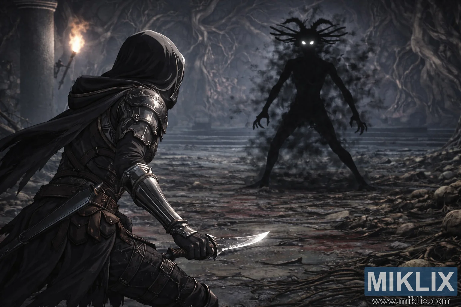 Do lado direito do enquadramento está a Sombra do Cemitério, um chefe humanoide estranho formado quase inteiramente por sombra viva. O seu corpo parece parcialmente insubstancial, com tentáculos negros, semelhantes a fumo, a flutuar para fora dos membros e do tronco, como se estivesse constantemente a dissolver-se e a reformar-se. As características mais marcantes da criatura são os seus olhos brancos brilhantes, que queimam a escuridão e fixam-se diretamente no Maculado, e as protuberâncias irregulares em forma de ramos que irradiam da sua cabeça como uma coroa torcida. Estas formas dão a impressão de algo outrora orgânico que foi corrompido ou oco, reforçando a natureza de mortos-vivos das catacumbas. A postura da Sombra do Cemitério espelha a cautela do Maculado: pernas ligeiramente afastadas, braços pendurados baixos com dedos em forma de garras curvados para dentro, prontos para atacar ou desaparecer na sombra a qualquer momento.
