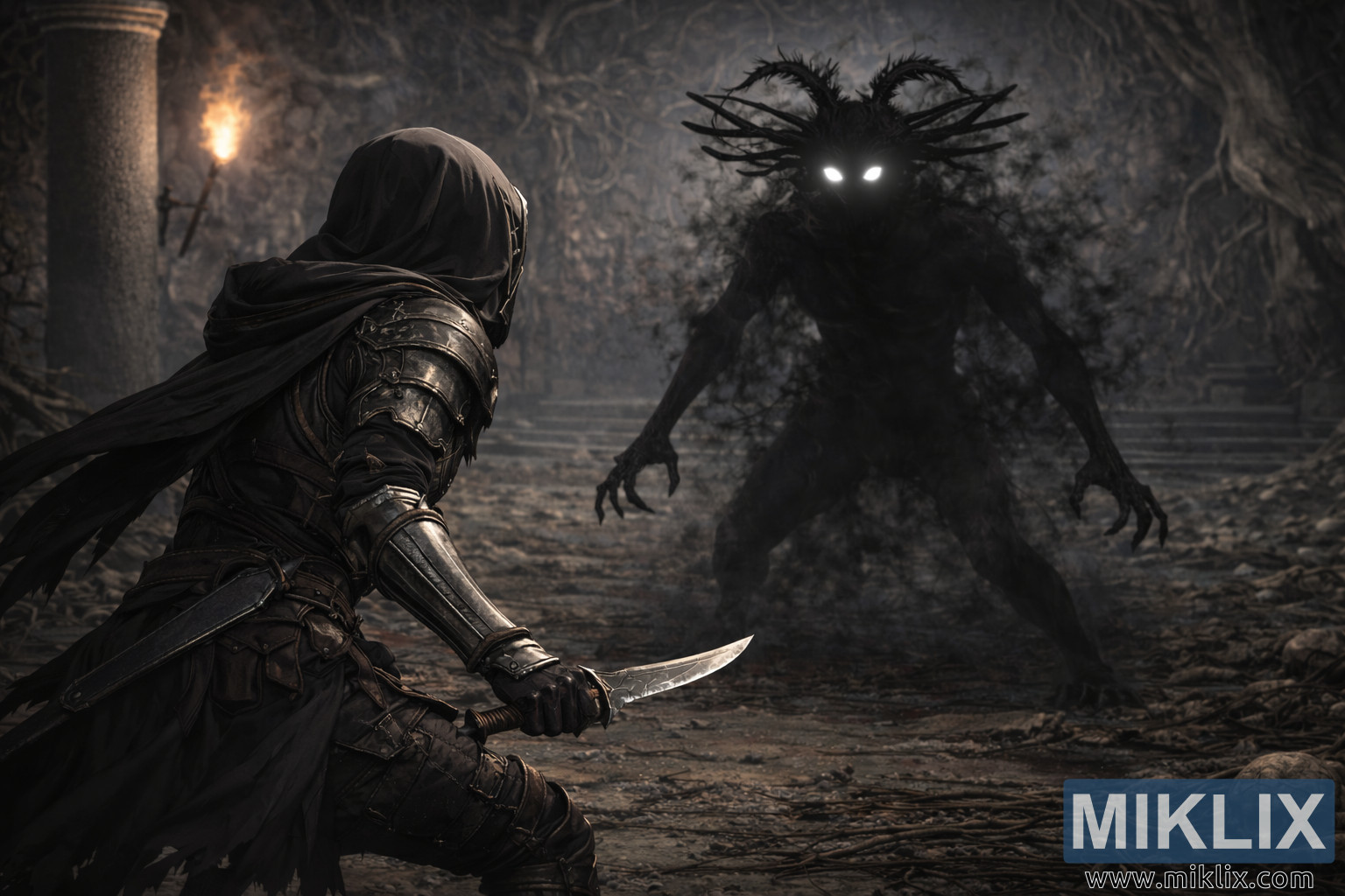 A imagem retrata uma cena de fantasia sombria e realista passada nas Catacumbas da Faca Negra de Elden Ring, representada com um estilo realista e pictórico que minimiza a exageração caricatural em favor do peso, textura e atmosfera. A câmara enquadra o confronto de perto, permitindo que o ambiente respire, criando uma sensação de tensão claustrofóbica em vez de espetáculo. No lado esquerdo do enquadramento, o Maculado é mostrado parcialmente de costas numa vista por cima do ombro, colocando o espectador diretamente na posição da personagem. O Maculado usa a armadura da Faca Negra, retratada com um acabamento discreto e realista. As placas de metal escuro estão gastas e arranhadas, as suas bordas desbotadas pelo tempo e pelo uso em vez de brilharem heroicamente. As camadas de tecido por baixo da armadura parecem pesadas e desgastadas, com bainhas desfiadas e dobras subtis que sugerem peso e movimento reais. Um capuz profundo sombreia a cabeça do Maculado, ocultando completamente o rosto e reforçando o anonimato e a contenção. A postura é baixa e deliberada, joelhos dobrados e torso inclinado para a frente, transmitindo uma prontidão construída sobre cautela em vez de bravata. Na mão direita do Maculado está uma adaga curta e curva, a sua lâmina refletindo um brilho frio ténue em vez de um brilho exagerado. O aperto é firme, controlado e próximo ao corpo, enfatizando precisão e contenção.