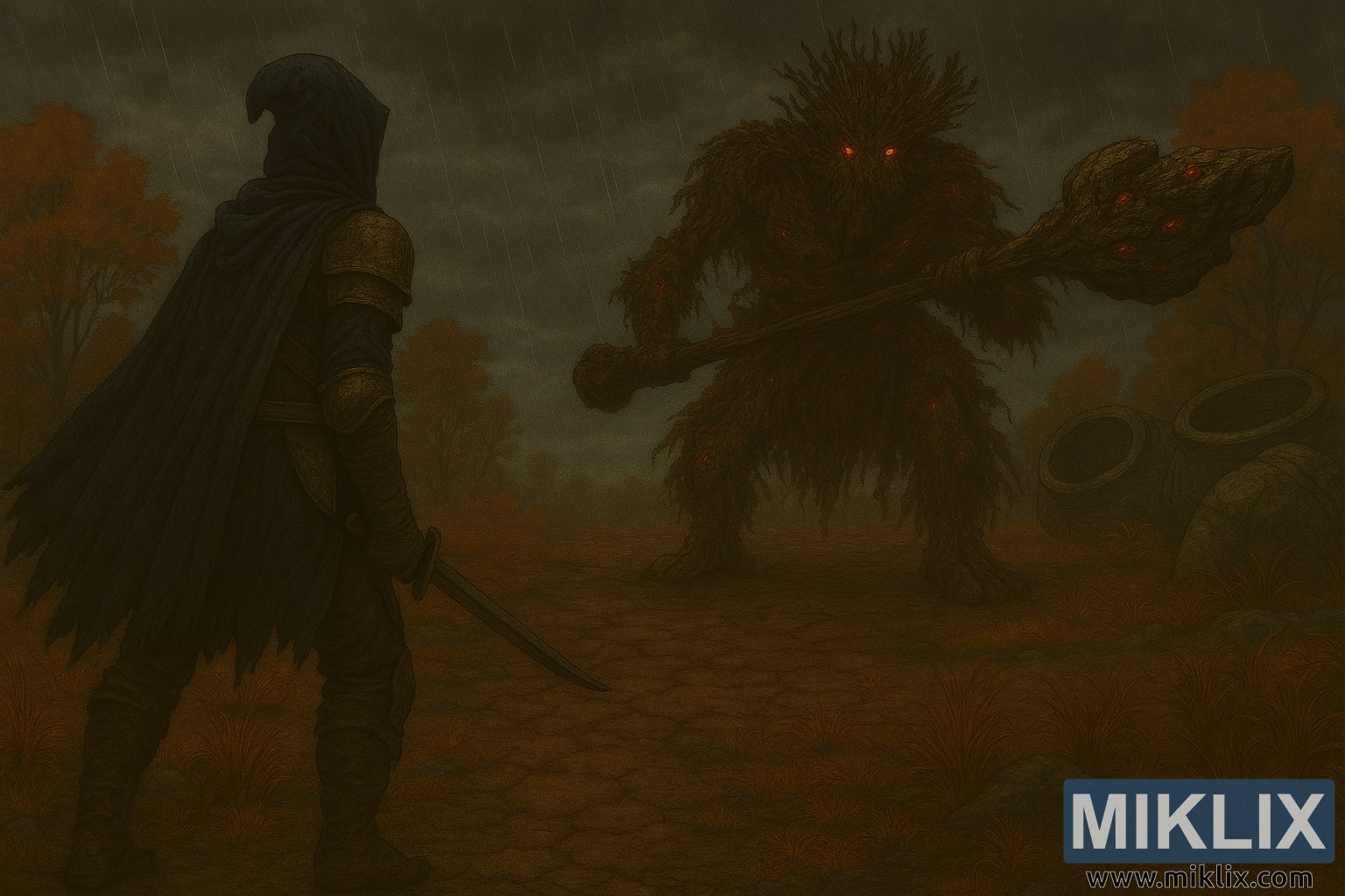 Fan art realista de fantasia sombria dos Maculados a enfrentar o Avatar Pútrido em Caelid, Elden Ring. Uma vista mais ampla, encharcada pela chuva, do campo de batalha.