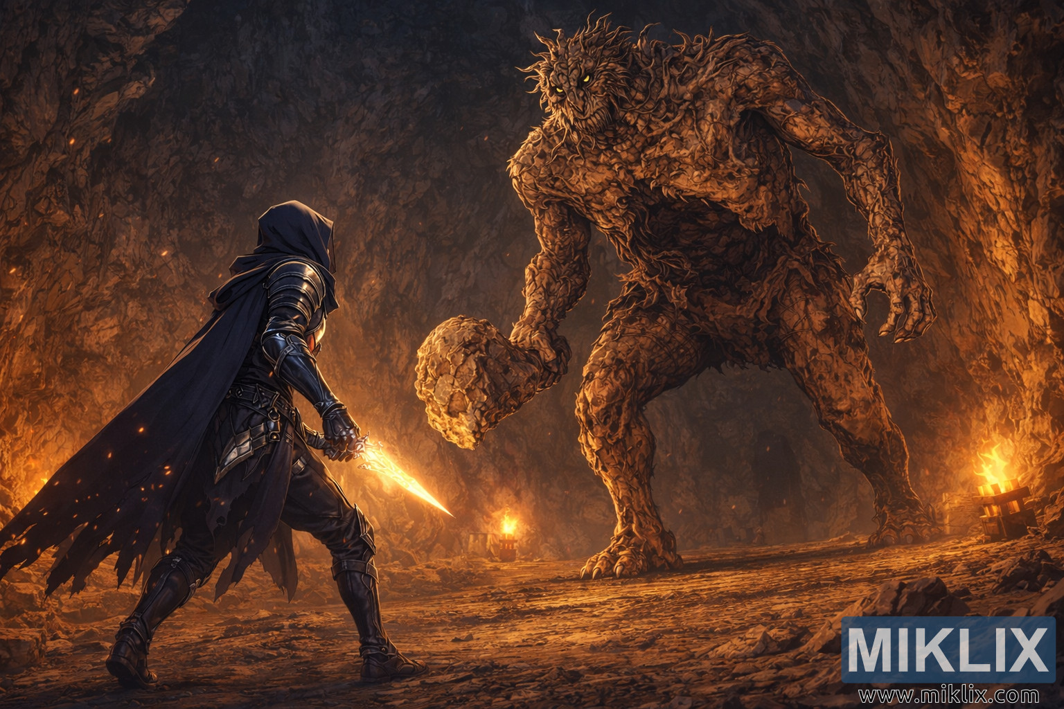 Esta ilustração de fantasia ao estilo anime apresenta um encontro pré-combate cheio de suspense nas profundezas dos Túneis Limgrave, onde um Maculado solitário vestido com uma elegante armadura da Faca Negra enfrenta um colossal Troll Escavador de Pedras cujo tamanho domina a caverna. O cenário subterrâneo é uma vasta câmara de pedra esculpida pelo tempo e pelo trabalho, com formações rochosas irregulares arqueadas acima como as costelas de uma besta antiga. A luz quente e alaranjada do fogo, vinda de braseiros e tochas dispersos, lança uma luz trémula pelo ambiente, produzindo contrastes dramáticos de ouro e sombra que intensificam a atmosfera de perigo e antecipação. No primeiro plano à esquerda, o Maculado é representado com uma postura reservada mas resoluta, os pés firmemente assentes em pedra irregular enquanto um manto escuro esvoaça por trás deles em movimento subtil. A armadura parece sobreposta e meticulosamente detalhada, refletindo finas fitas de luz do fogo nas suas extremidades, enquanto um capuz oculta o rosto para preservar o anonimato e o mistério. Uma adaga luminosa é mantida baixa mas pronta, a sua luz dourada formando um contrapeso visual aos tons mais escuros da caverna e sugerindo poder contido em vez de agressividade imediata.
