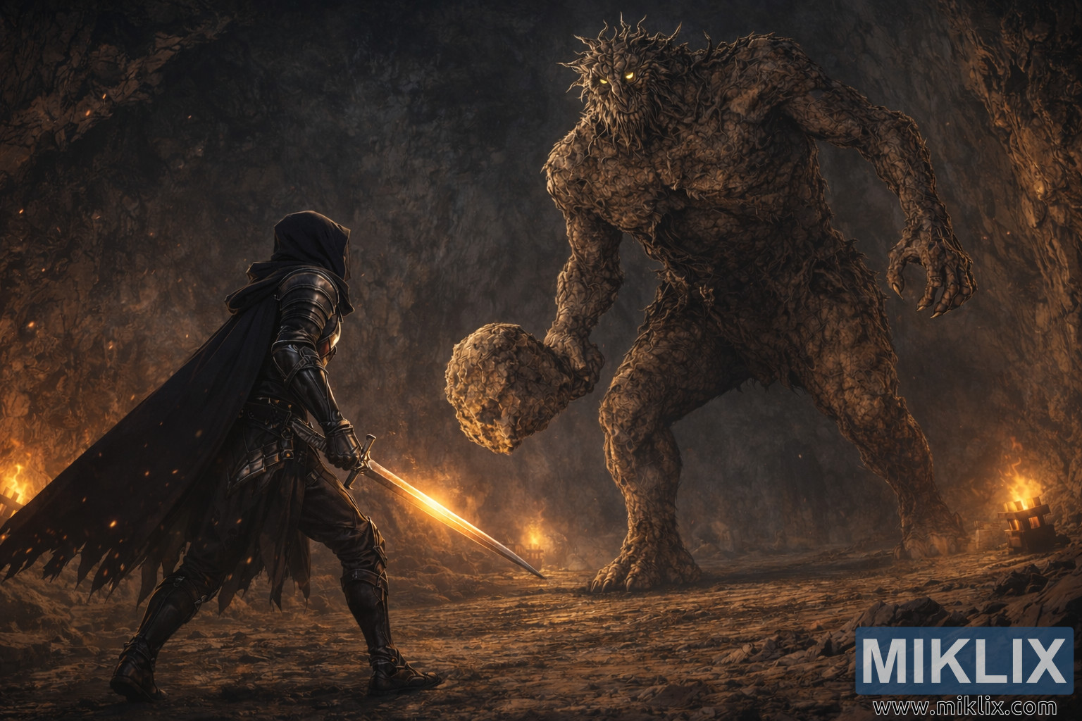 Arte cinematográfica de fantasia semi-realista que mostra um guerreiro encapuzado com uma espada luminosa a enfrentar um troll de pedra colossal dentro de uma caverna subterrânea em chamas antes da batalha.