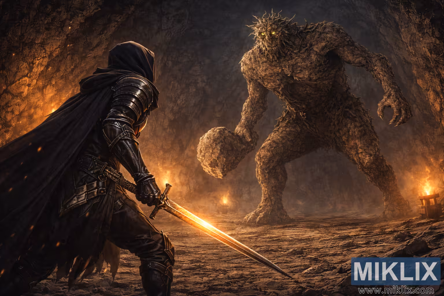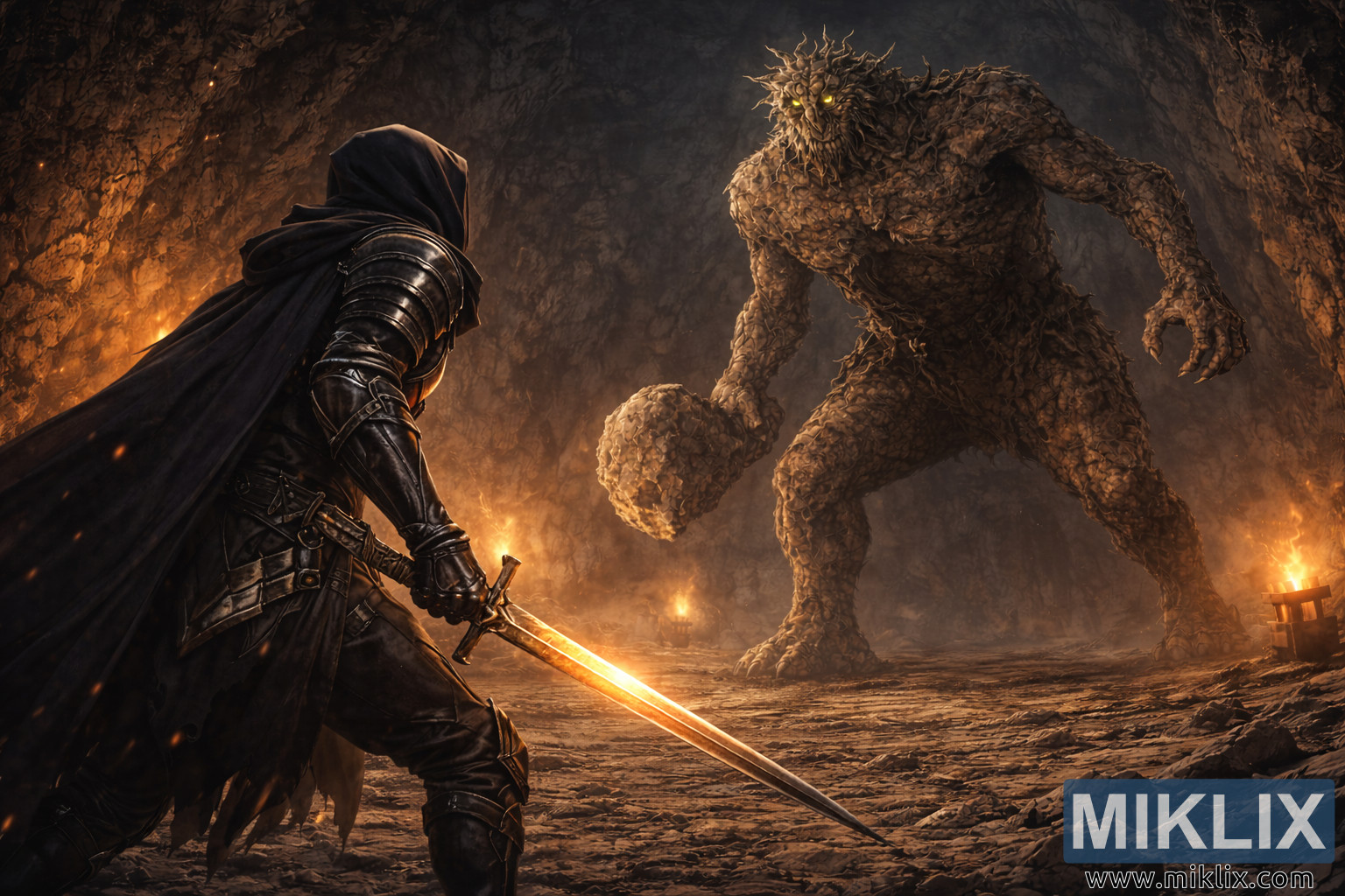 Arte cinematográfica semi-realista de fantasia que mostra um guerreiro encapuzado visto de costas a enfrentar um troll de pedra colossal dentro de uma caverna subterrânea em chamas momentos antes da batalha.