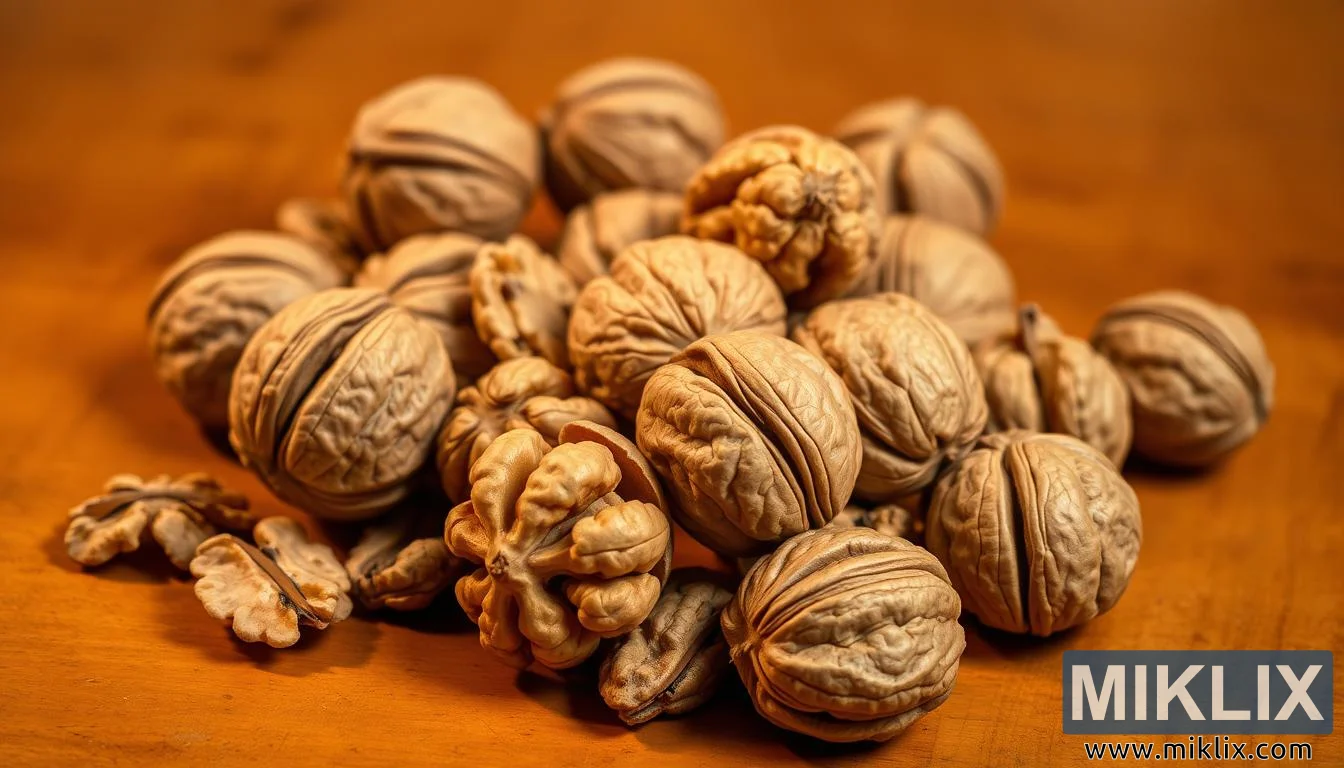 Natureza-morta de nozes orgânicas em cascas e metades em uma superfície de madeira, banhada por luz quente, destacando sua rica textura, nutrição e benefícios para a saúde.